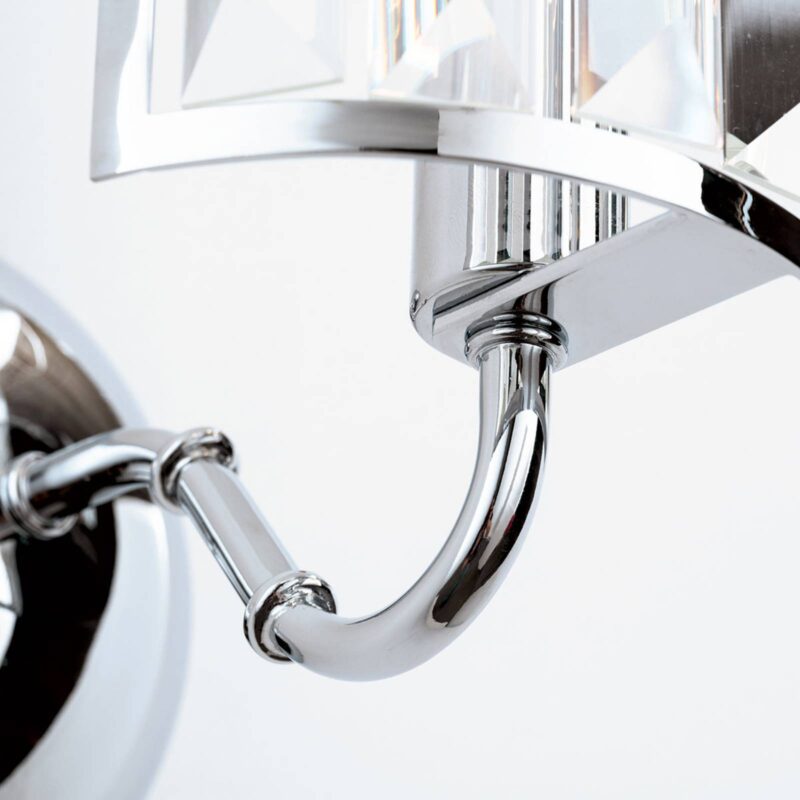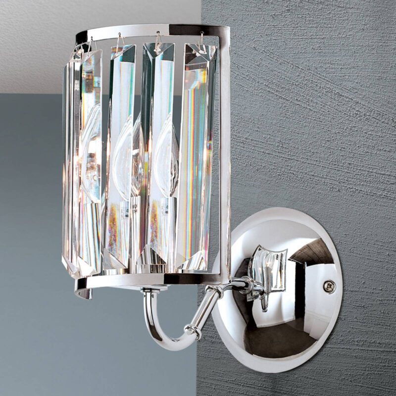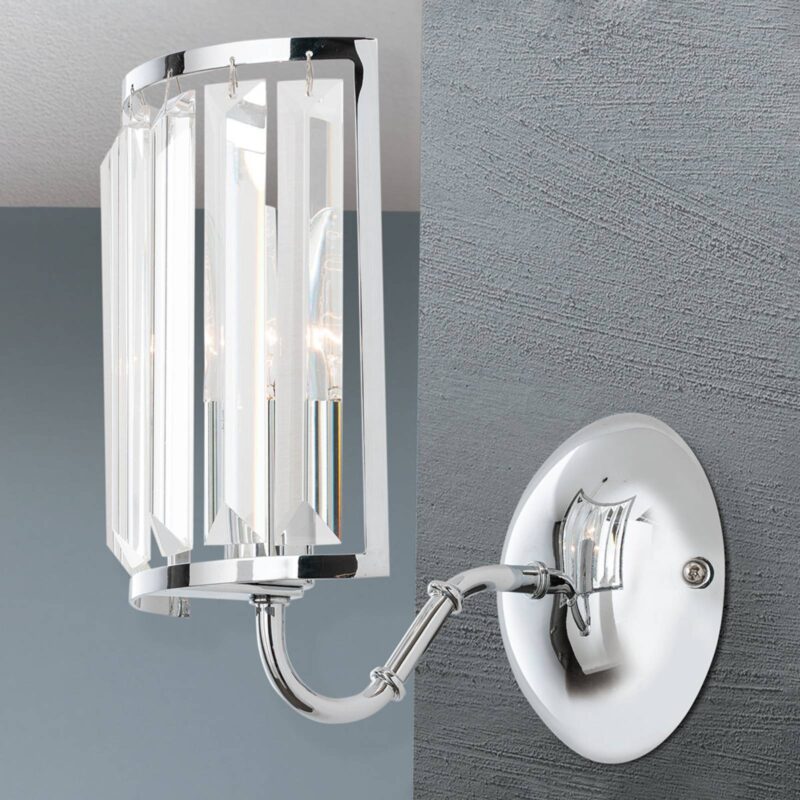 Zdobené nástenné svietidlo Gstaad s visiacimi krištáľmi Nástenné svietidlo Gstaad pôsobí vďaka lesklému pochrómovanému nástennému držiaku a ramenu aj vo vypnutom stave ako slávnostná dekorácia obytného priestoru. Keď sa osvetlenie zapne, vyžarované svetlo použitej žiarovky sa rozleje po krištáľoch a nádherne sa v nich odráža. Krásny lesk sa ešte zvýrazní pochrómovaným kovom. Dodatočný zdroj svetla, ktorý nielenže poskytuje pôsobivé svetlo, ale aj vytvára vynikajúci celkový dojem.