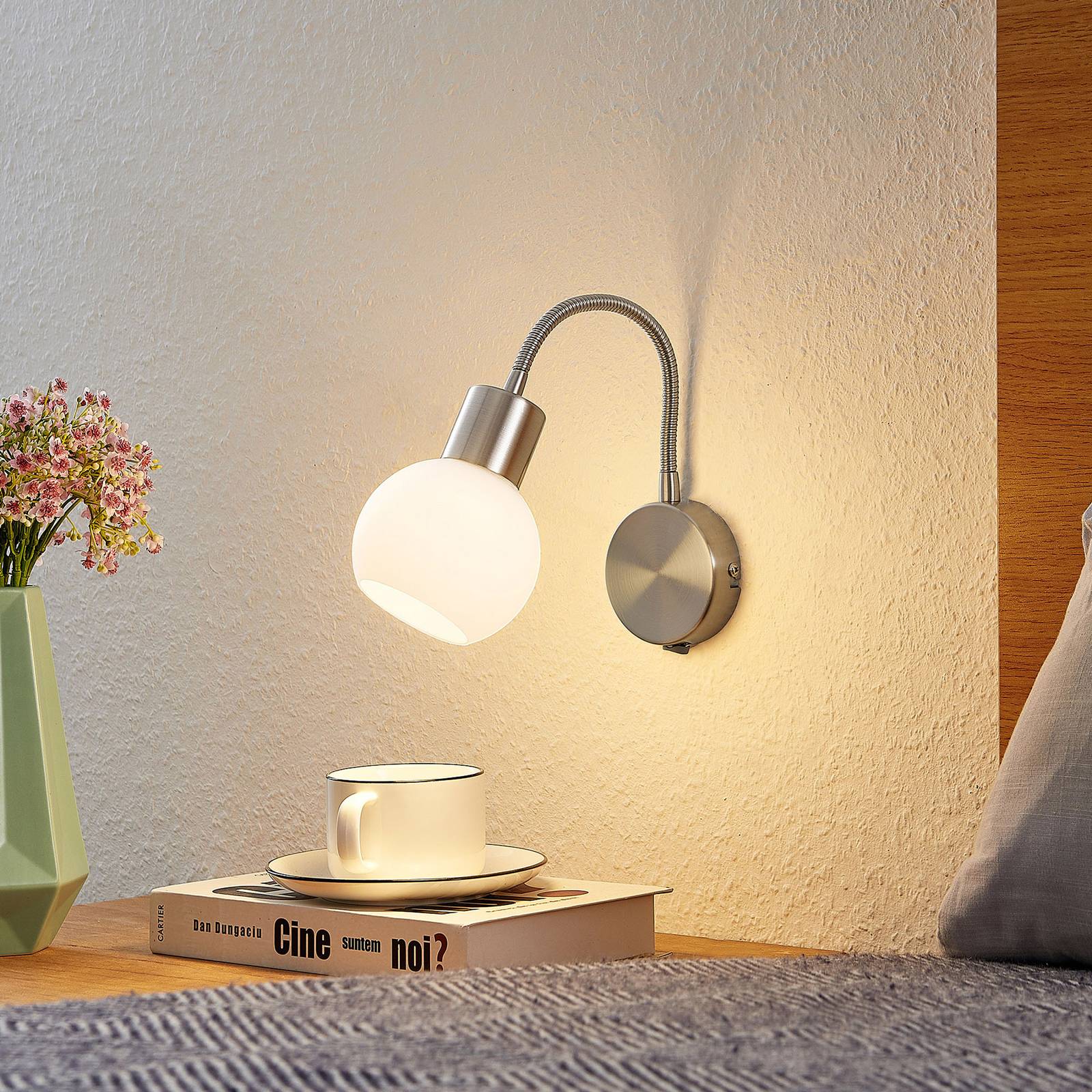 Moderné nástenné svietidlo Lioma s flexibilným ramenom Nástenné svietidlo Lioma zaujme svojou mobilitou a atraktívnym dizajnom, ktorý možno dokonale integrovať do moderných štýlov. Má opálovo biele sférické sklenené tienidlo, ktoré jemne a rovnomerne vyžaruje svetlo. Toto svetlo je ideálne na umiestnenie v obývacej izbe v blízkosti pohovky alebo v spálni ako svetlo na čítanie. Dá sa použiť rôznymi spôsobmi, najmä preto, že sa dá flexibilne nakláňať a otáčať.