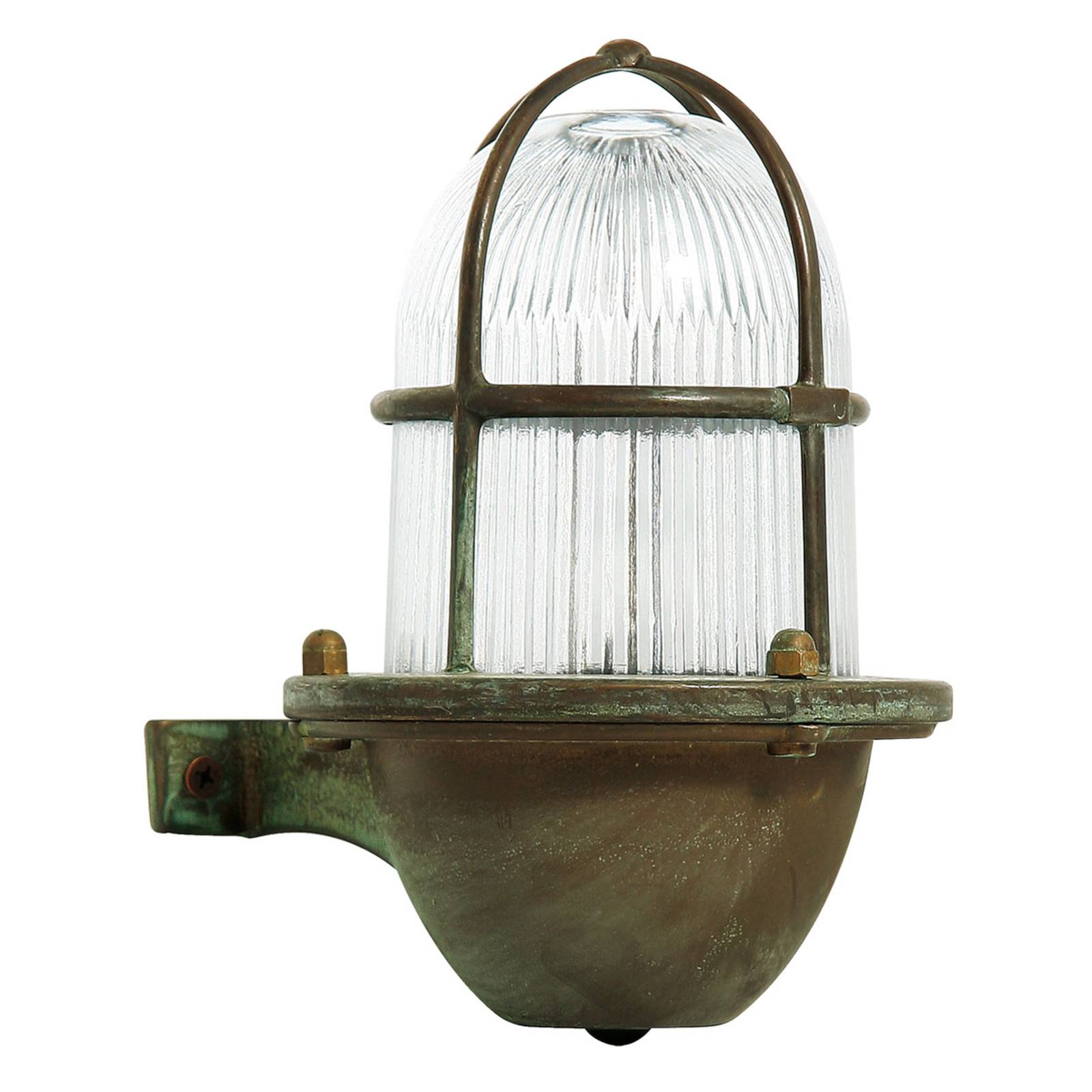 Vonkajšie nástenné svietidlo Ocean v námornom štýleVonkajšie nástenné svietidlo Ocean bolo vyrobené z tmavej mosadze a pripomína staré lodné svetlá. Očividná a zároveň jednoduchá elegancia tohto svietidla bola vytvorená kombináciou štrukturálneho skla a starožitnej mosadznej povrchovej úpravy. Zelený nádych ako patina umocňuje starožitný charakter nástenného svietidla. Mriežka, ktorá obklopuje sklo, je dekoratívna a zároveň ochranná. Vďaka krytiu IP44 je svietidlo bez váhania vhodné na vonkajšie použitie.