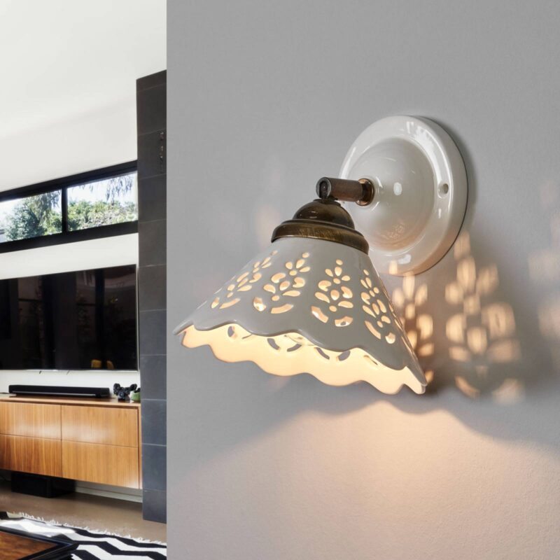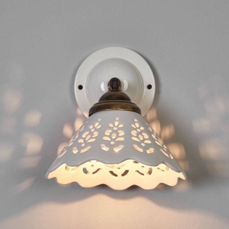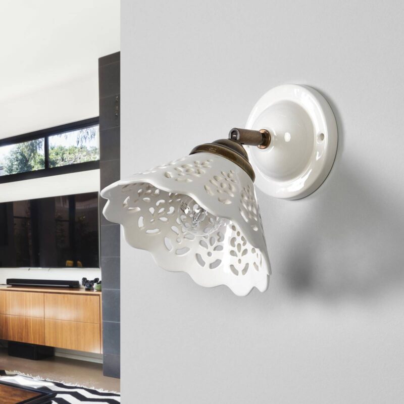 Ušľachtilá keramická nástenná lampa PIZZO Táto očarujúca nástenná lampa PIZZO je vhodná do romanticky zariadených miestností. Biele glazované keramické tienidlo s dekoratívnym vzorom dier a zaobleným okrajom pripomína čipkovú látku a dodáva romantický šmrnc. Svetlo sa dobre odráža a vyžaruje dopredu. Pomocou guľového kĺbu možno tienidlo nastaviť podľa požiadaviek na osvetlenie.