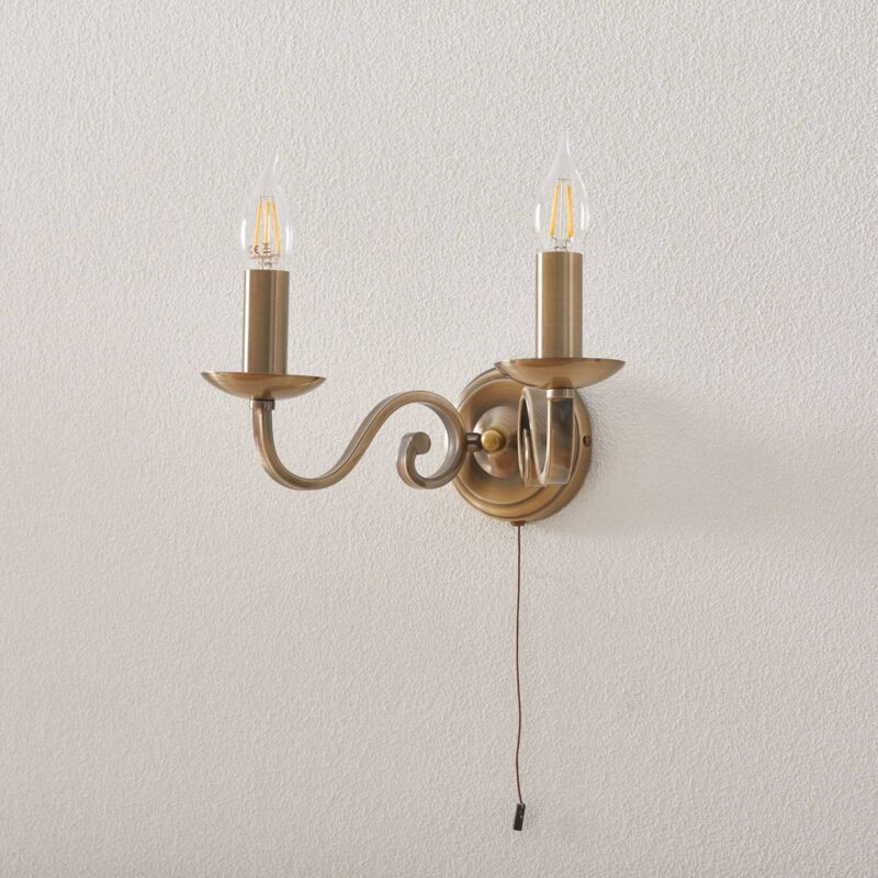 Klasické nástenné svietidlo Richmond s vypínačom Starožitná mosadz, elegantné krivky a ťahový spínač dodávajú nástennému svetlu Richmond nostalgický vzhľad. Je vybavený dvoma žiarovkami v optike sviečok, ktoré napríklad pri použití moderných žiaroviek šikovne napodobňujú skutočnú sviečku. Nástenné svetlo je možné zapínať a vypínať priamo pomocou malého ťahového spínača. Richmond je vhodný na dodatočné atmosférické svetlo v obývacej izbe, jedálni alebo na chodbe.