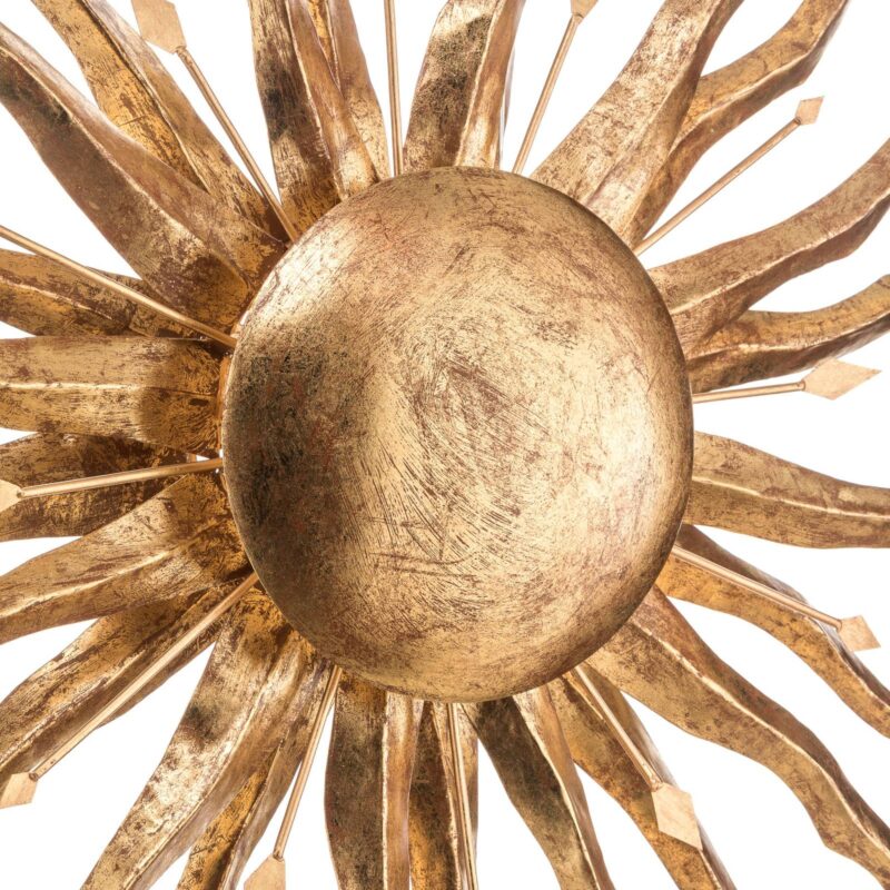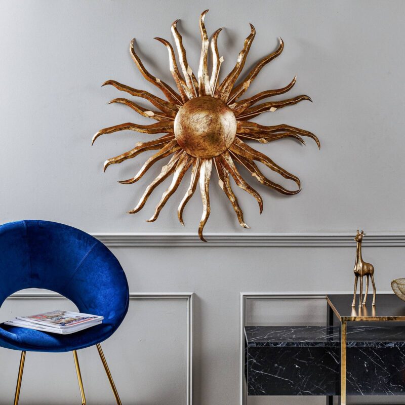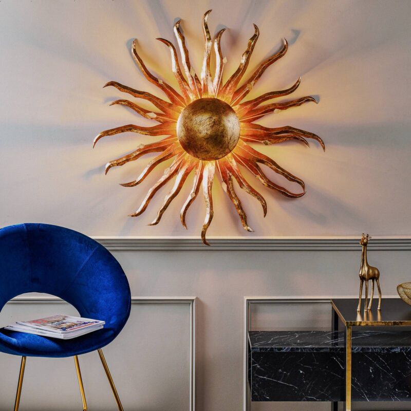 Nástenné svietidlo SONNE GOLD GIGANTE- Očarujúci pútač pohľadov Nástenné svietidlo SONNE GOLD GIGANTE možno použiť ako pútač pohľadov v každej miestnosti, kde poskytuje teplo a svetlo. Svetlo sa láme v ručne kovaných slnečných lúčoch a vytvára pôsobivé hry svetla. Svietidlo SONNE GOLD GIGANTE možno použiť ako nástenné aj stropné svietidlo. Toto svietidlo je jedinečne krásne a poskytuje príjemné nepriame osvetlenie.