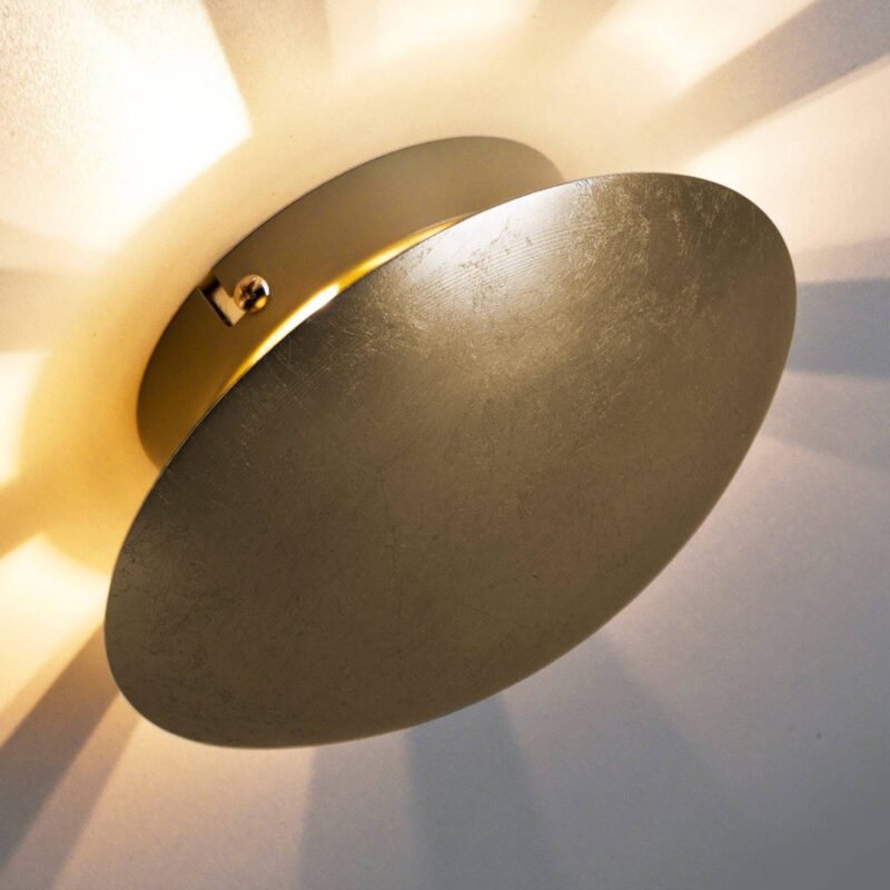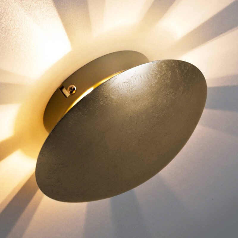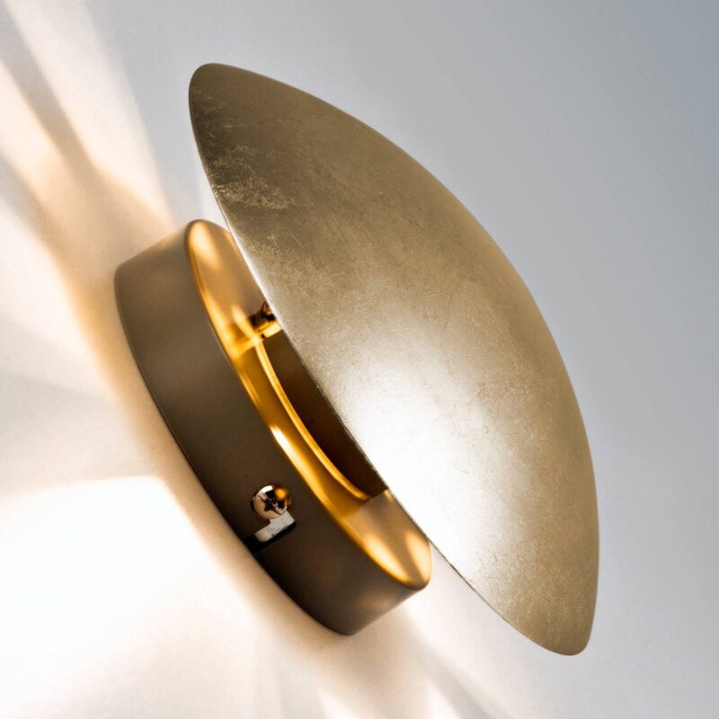 Nástenné svietidlo Západ slnka – okrúhle a zlaté Nástenné svietidlo Sunset vyrobené z kovu kombinuje nadčasový guľatý tvar s ušľachtilou zlatou povrchovou úpravou. Svetlo sa odráža od zadnej časti konvexného krytu v tvare disku a vytvára na stene lúčový vzor. Tak sa vytvorí vzhľad, ktorý pripomína slnko. Západ slnka je ideálnym pútačom pozornosti pre zvýraznenie a dodatočné osvetlenie súkromných vnútorných priestorov.