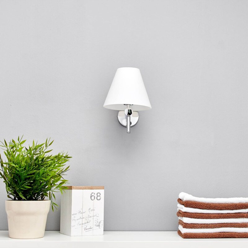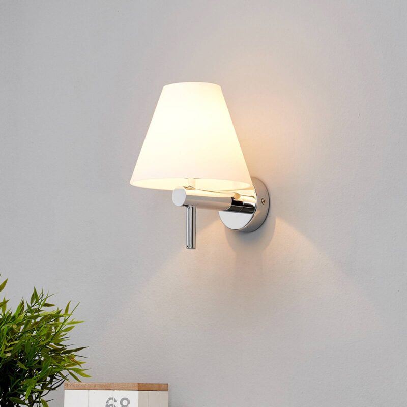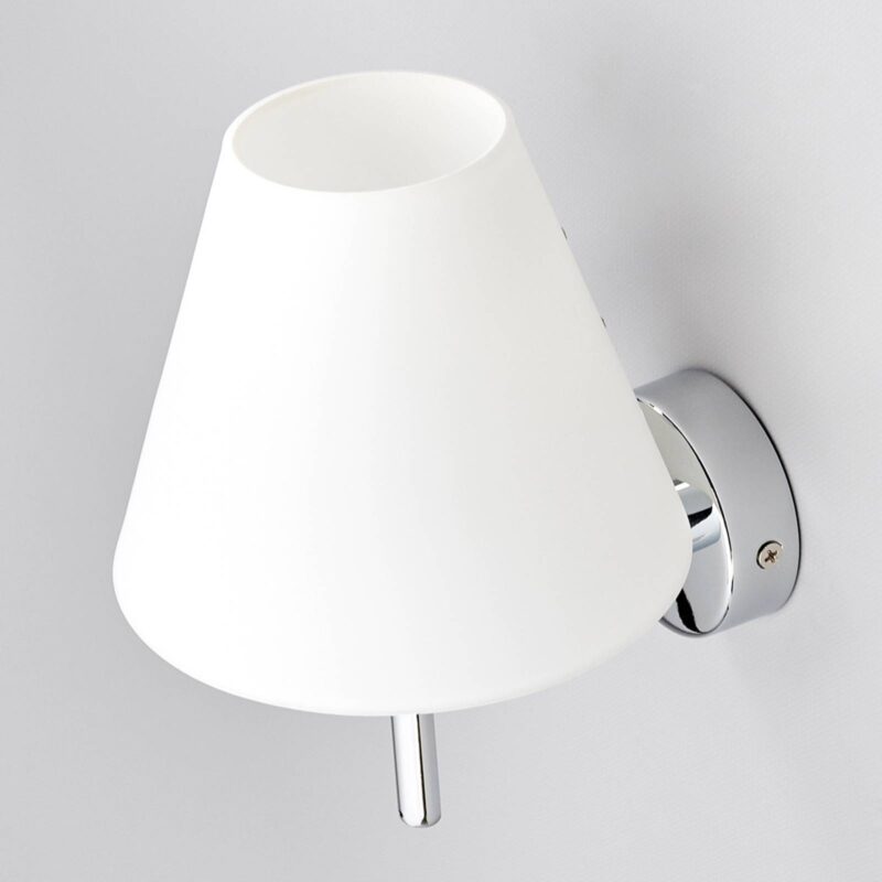 Zrkadlové svietidlo Violetta s tienidlom z mliečneho skla Tienidlá, ktoré sa smerom nahor zužujú, už patria k akýmsi stereotypom elektrického osvetlenia. Ide o veľmi klasický a desaťročiami, ak nie rovno stáročiami, overený tvar svietidiel. Tienidlo tohto nástenného svietidla je vyrobené z mliečneho skla, ktoré vytvára príjemne teplé a mäkké osvetlenie, pričom nástenný držiak je z lesklého chrómu. Harmonická kombinácia farieb a materiálov sa hodí k mnohým interiérovým štýlom a toto nástenné svietidlo, zvlášť vo dvojici, bude skvelo vyzerať vedľa zrkadla, pretože vyžaruje mimoriadnu eleganciu.