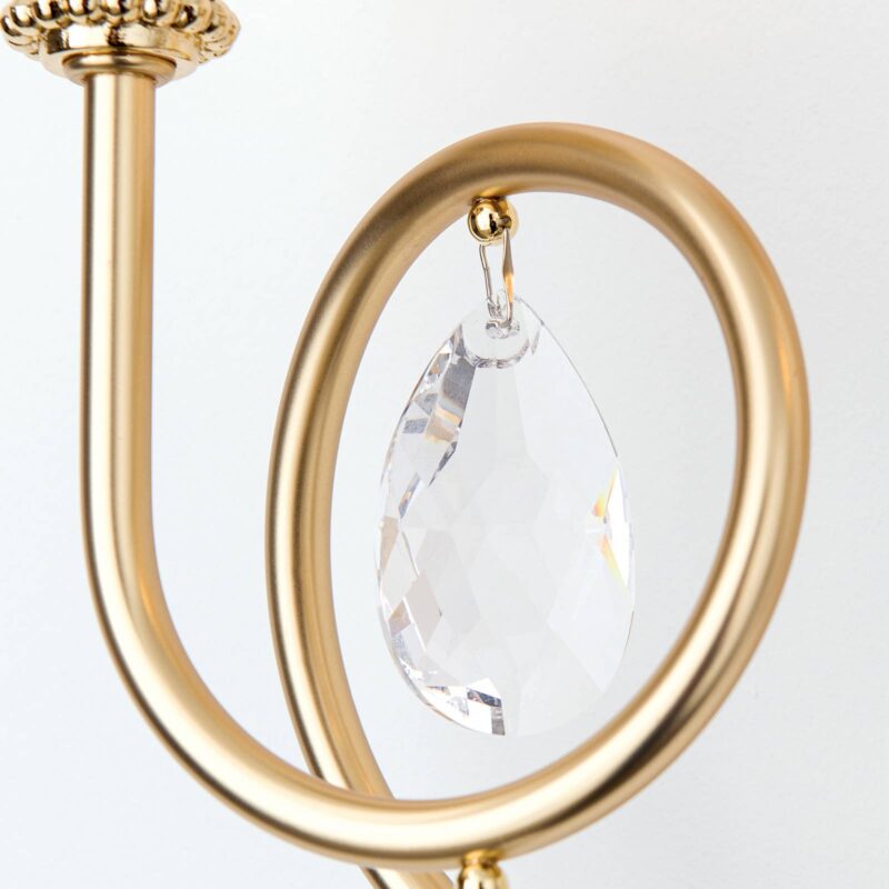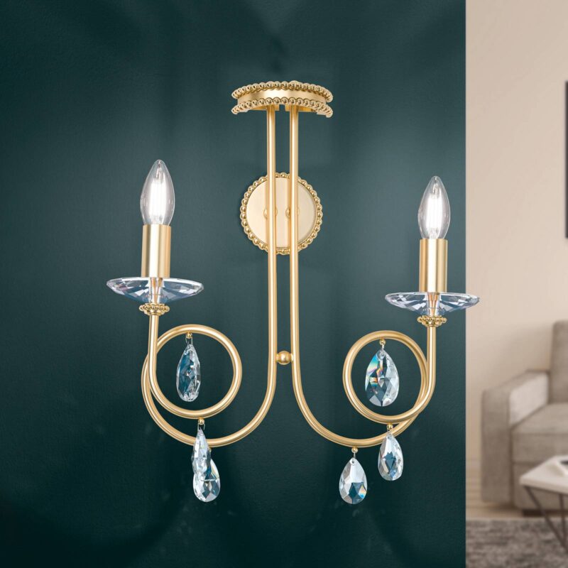 Pozlátené nástenné svietidlo Violetta s krištáľovými visiacimi prvkami – dve žiarovky Pozlátené nástenné svietidlo Violetta s dvoma žiarovkami v štýle svietnika prebudí očarujúcu atmosféru. Umelecky tvarované ramená svietidla a ušľachtilé krištále Swarovski vytvárajú žiarivý lesk. Violetta je mimoriadne krásne atmosferické svietidlo do obytných priestorov alebo slávnostného prostredia.
