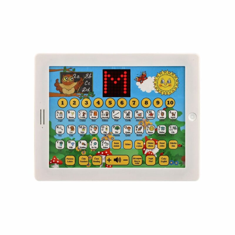 Dvojjazyčný dotykový tablet s LCD displejom učí deti čítať, písať a počítať. Môžu si precvičiť abecedu, čísla, slovíčka v češtine aj angličtine, ročné obdobia, mesiace, dni v týždni, ale aj detskú etiketu alebo dôležité telefónne čísla. Ďalej si vypočujú, ako prebieha celý deň.Hračku uvediete do prevádzky stlačením okrúhleho tlačidla a ďalej si vyberáte funkcie pomocou dotykov prstom. Rozvíja slovnú zásobu, predstavivosť a logické myslenie, zdokonaľuje jemnú motoriku, rozvíja zrak a sluch.Vhodné pre deti od 3 rokov.Batérie 3x AAA sú súčasťou výrobku.