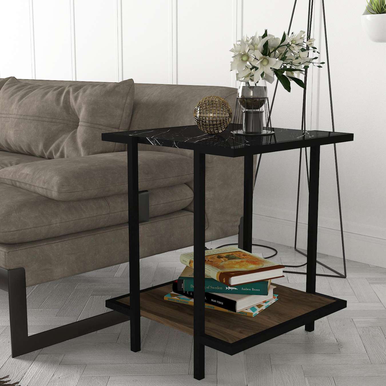 NERVA industriálny príručný stolík, orech/čierny mramor
