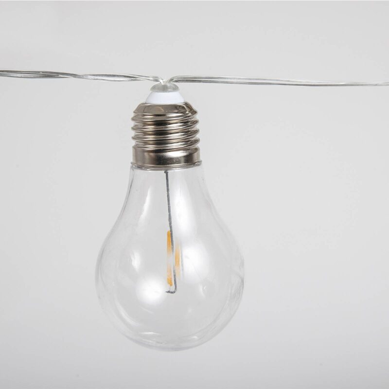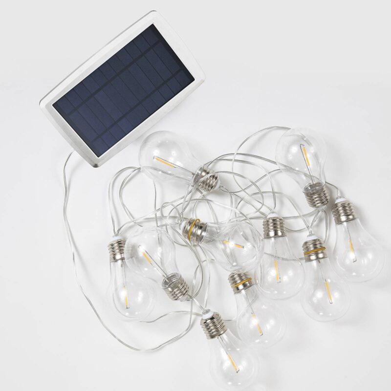 LED solárna svetelná reťaz Stella s teplými bielymi žiarovkami LED solárna svetelná reťaz Stella sa skladá z desiatich žiaroviek v žiarovkovom vzhľade a vďaka stupňu krytia IP44 ju možno bez obáv používať v exteriéri. Dekoratívne svetelné zdroje vyžarujú teplé svetlo do exteriéru a sú vhodné na použitie napríklad na balkóne, terase alebo v záhrade. Vďaka solárnemu panelu, ktorý je súčasťou balenia, možno svetelnú reťaz flexibilne umiestniť a alternatívne ju možno nabíjať aj cez kábel USB. – Čas nabíjania solárnym panelom: 8 hodín – Čas nabíjania káblom USB: 5,5 hodiny – Doba svietenia až 10 hodín