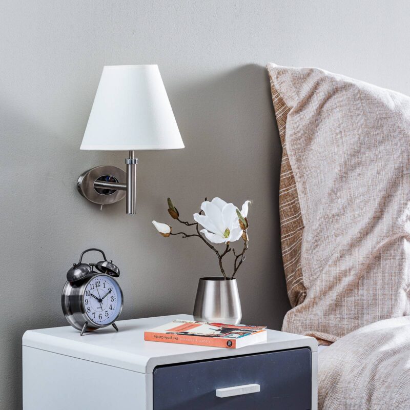 Pekné nástenné svietidlo Lilly s jednou žiarovkou Nástenné svietidlo Lilly pôsobí ako klasické stolové svietidlo nainštalované na stenu. V obytných priestoroch a spálňach vás očarí mimoriadne príjemným vzhľadom. Matný niklový povrch vytvára elegantný prvok a biele látkové tienidlo dodáva lampe atmosféru.