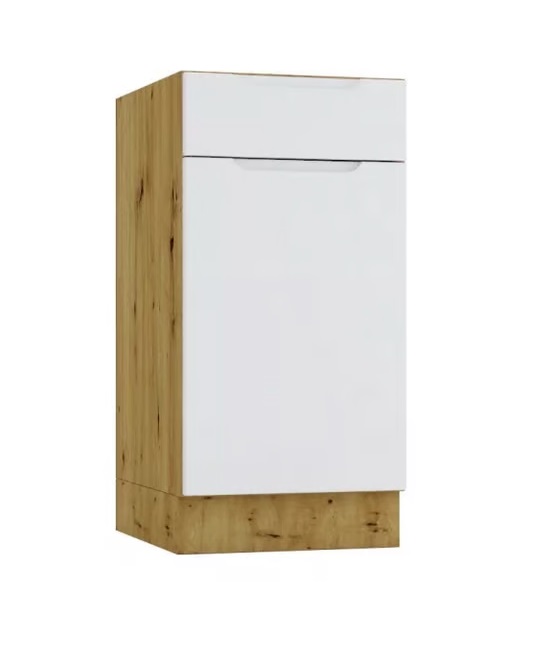 NIKOLE je jedinečný kuchynský nábytok, ktorý spája funkčnosť so štýlovým prevedením. Nábytok NIKOLE dodá každému priestoru osobitý charakter a zapadne do moderných a minimalistitkých interiérov..Nábytkové dosky sú vyrobené z LTD dosky o hrúbke 16 mm. Je nenáročná na údržbu, zaručuje trvácnosť a odolnosť. Nábytok disponuje nastaviteľnými nožičkami. Úchytky sú plastové.Rozmery skrinky (š,v,h): 40 x 82 x 44,6 cm.Farebné prevedenie: dub Artisan / svetlošedá.Kuchynský nábytok NIKOLE sa skladá z viacerých prvkov, vďaka ktorým si vyskladáte kuchyňu podľa vašich potrieb a predstáv.Dodávame v demontovanom stave.