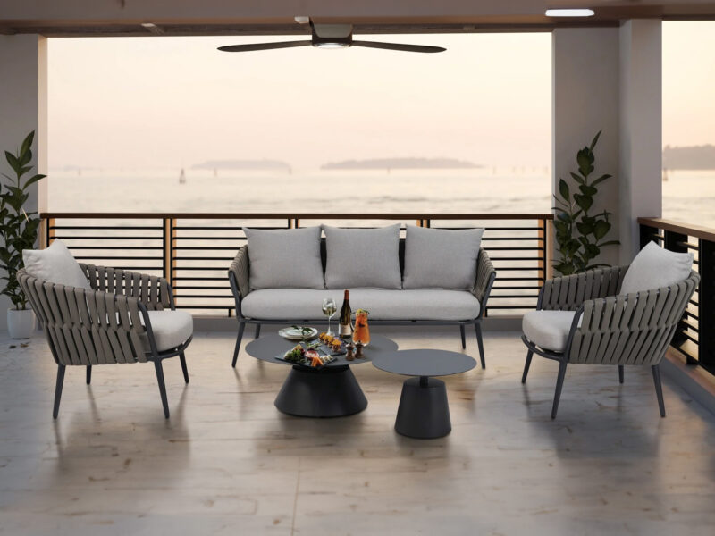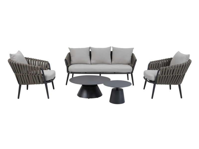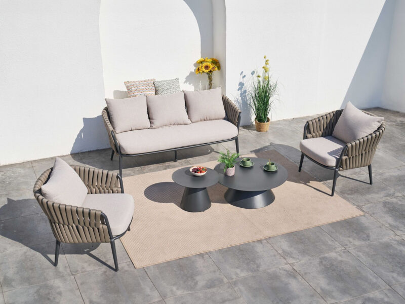 Sedacia súprava Nizza v modernom dizajne ponúka pohodlie a štýl pre váš exteriér. Zaujímavým detailom je hrubý textilný výplet, ktorý dodáva súprave jedinečný vzhľad. Praktické prevedenie a odolnosť voči poveternostným podmienkam z nej robia ideálne riešenie na terasu či záhradu.