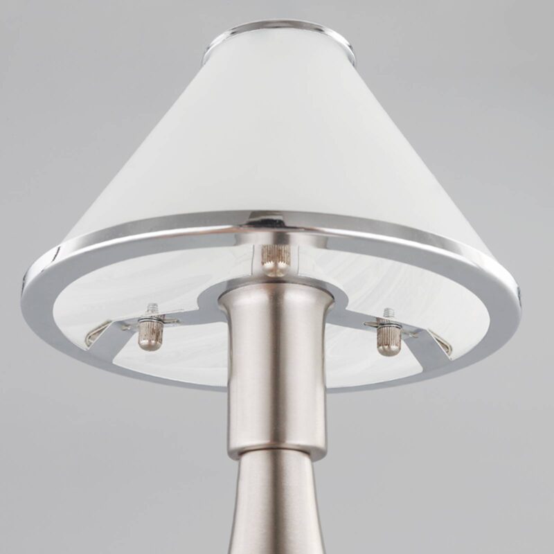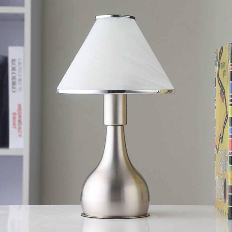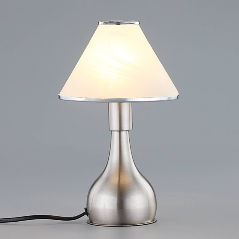 Elegantná nočná lampa Ellen s alabastrovým skleneným tienidlom Táto nočná lampa poskytuje zvlášť útulný efekt, pretože jej biele tienidlo s jemne zahmleným povrchom vytvára pri zapnutí teplé a rovnomerne rozptýlené svetlo. Na ovládanie stačí iba ťuknúť na podstavec, pretože tam sa nachádza dotykový spínač, ktorý uľahčuje zapínanie a vypínanie svietidla Ellen. Okrúhly cibuľový podstavec má matný niklový povrch, ktorý dobre ladí s bielym tienidlom. Vzhľad nočnej lampy sa hodí tak ku klasickým, ako aj k modernejším štýlom a pri výbere umiestnenia sa Ellen neobmedzuje len na nočné stolíky v spálni, ale dá sa použiť aj v obývacej izbe alebo na komode v chodbe.
