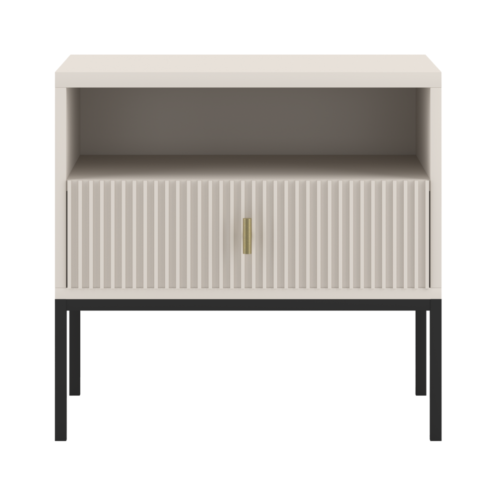 Nočný stolík MAGIRA MA06 zaujme moderným dizajnom aj praktickým spracovaním, vďaka čomu sa stane štýlovým a funkčným doplnkom každej spálne. Je súčasťou sektorovej kolekcie MAGIRA, ktorá vyniká decentným frézovaným dekorom na čelných plochách a elegantným farebným prevedením v odtieni kašmír. Čierne kovové nožičky dodávajú celku odľahčený vzhľad, zatiaľ čo zlatá úchytka prináša jemný akcent luxusu.Stôl je navrhnutý s ohľadom na každodenné pohodlie – ponúka praktickú zásuvku na odloženie drobností a otvorenú policu na knihu, pohár s vodou alebo dekoráciu. Stabilná konštrukcia kombinuje laminovanú DTD dosku, MDF a HDF s odolnými ABS hranami, čo zaisťuje dlhú životnosť a ľahkú údržbu. Minimalistický štýl je podčiarknutý systémom PUSH OPEN u ostatných prvkov kolekcie, ktorý umožňuje ľahké otváranie bez potreby úchytiek.Nočný stolík MAGIRA MA06 sa ľahko kombinuje s ďalšími komponentmi z kolekcie a zapadne do moderných interiérov, ako aj do tlmených, útulných priestorov. Pre bezpečné používanie odporúčame stolík pripevniť k stene. Dodáva sa v rozloženom stave a jeho montáž je vďaka prehľadnému návodu jednoduchá.Parametre a špecifikácie