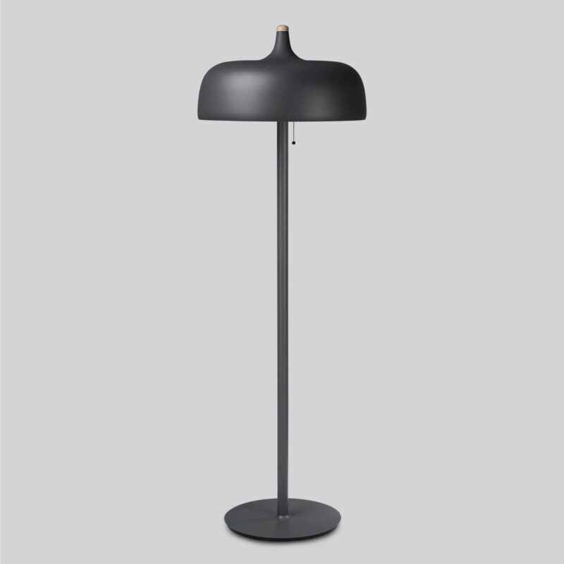 Dizajnová stojacia lampa Acorn v škandinávskom dizajne: vrchná časť tienidla z dreva je vymeniteľná Stojacia lampa Acorn s hliníkovým tienidlom zaujme moderným škandinávskym vzhľadom, ktorý vytvoril Atle Tveit a pochádza z roku 2021. Vynikne aj bez osvetlenia, najmä vďaka krásnemu tvaru tienidla. Vďaka monochromatickému laku sa diskrétne začlení do mnohých štýlov interiéru. Veľké tienidlo vytvára veľmi príjemné doplnkové osvetlenie s veľkoplošným osvetlením okolia, napr. v obývacej izbe s posedením. Vrchná časť tienidla je zdobená dreveným prvkom, ktorý sa dá meniť. Súčasťou dodávky je jeden drevený hrot vo farbe svetlý buk a jeden vo farbe tmavý orech.
