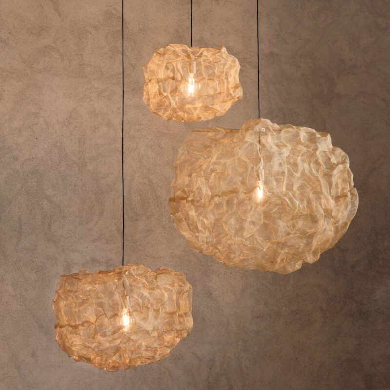 Tepelná závesná lampa z mosadze vo vzrušujúcom dizajne Heat je dynamické svietidlo, ktoré naplní interiér kreativitou a predstavivosťou. Skladá sa zo tienidla z lesklej mosadznej tkaniny, ktoré obklopuje žiarovku, ktorú treba vložiť. Táto látka vytvára veľmi zvláštne osvetlenie a jej tvar pripomína oblak. Svetlo premení tienidlo na ohnivý oblak, ktorý osvetlí miestnosť. Závesné svietidlo vzniklo na základe tvorivých experimentov dizajnérky Johanny Forsberg. Teplo distribuuje nórsky výrobca osvetlenia a nábytku Northern, ktorého cieľom je estetické spojenie krásy a funkčnosti.
