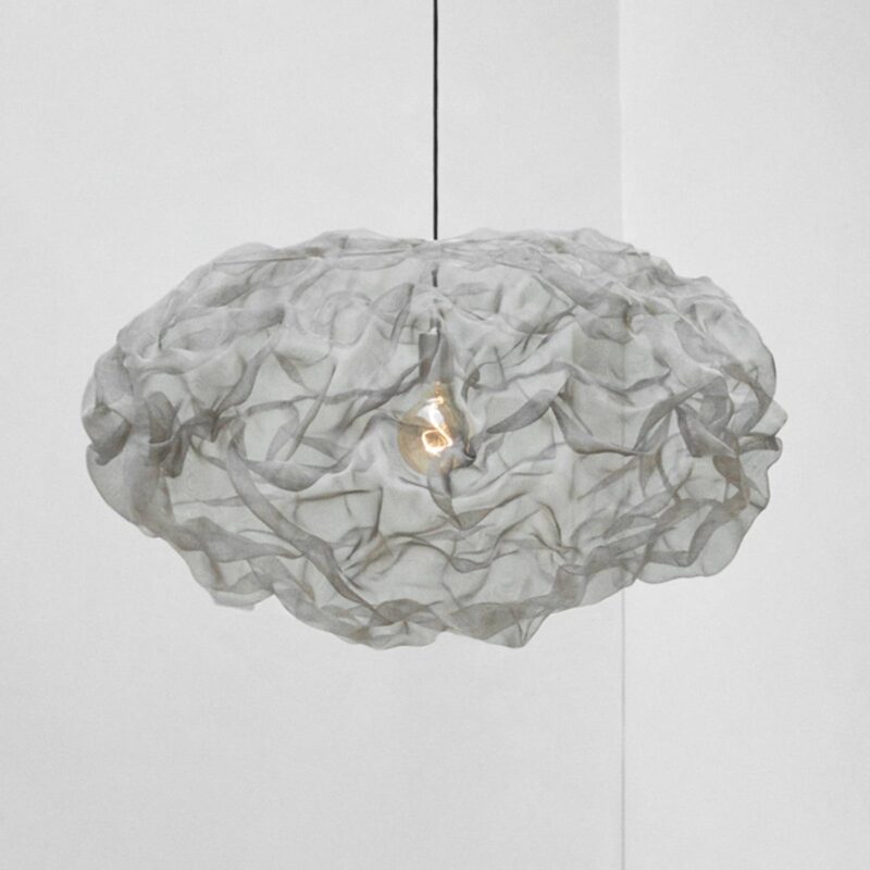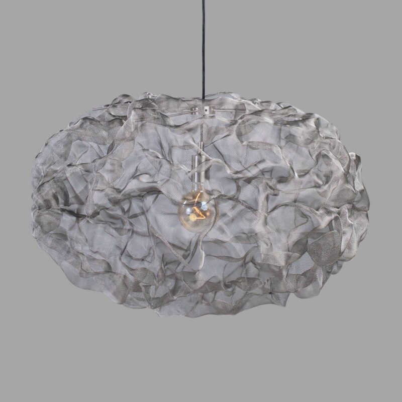 Umenie a dizajn v dokonalej harmónii – Závesná žiarovka tienidlo na lampu efektnej závesnej lampy Desginer Heat sa skladá z nerezovej sieťoviny – jemne sieťovanej a s trblietavým strieborným tónom. Sochársky povrch, ktorý vyzerá ako veľký oblak s mnohými vlnami, je pôsobivý a uchváti každého diváka. Závesná žiarovka Heat, ktorá je umiestnená na poprednom mieste, ponúka špeciálny druh pútača pozornosti pre každú izbu a môže byť integrovaná do konceptu vybavenia ako cielený dizajnový objekt. Svietidlo Heat rozvinie svoje plné kúzlo až po zapnutí svetla. Pretože svetlo môže presvitať cez polopriehľadnú tienidlo na lampu , zdá sa, akoby v miestnosti plával strieborný mrak. Difúzne svetlo, ktoré vyžaruje, osvetľuje miestnosť spoľahlivo a zo všetkých strán.