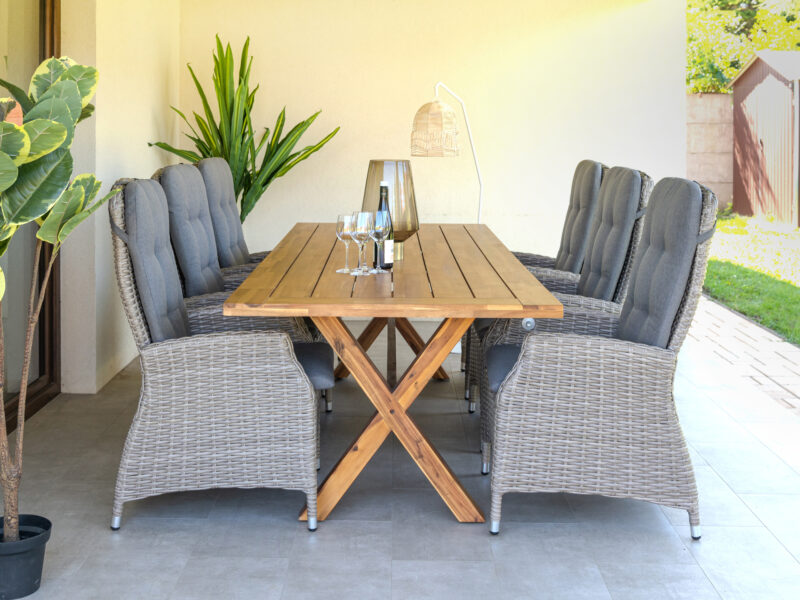 Veľký Norwick teakový stôl so šiestimi Soho Comfort polohovateľnými kreslami je ideálna voľba na rodinné posedenia aj priateľské stretnutia. Pevný stôl a pohodlné kreslá s nastaviteľným operadlom vytvoria miesto, kde sa každý cíti príjemne.