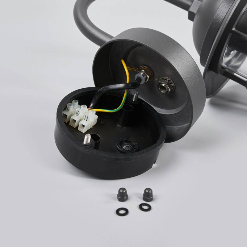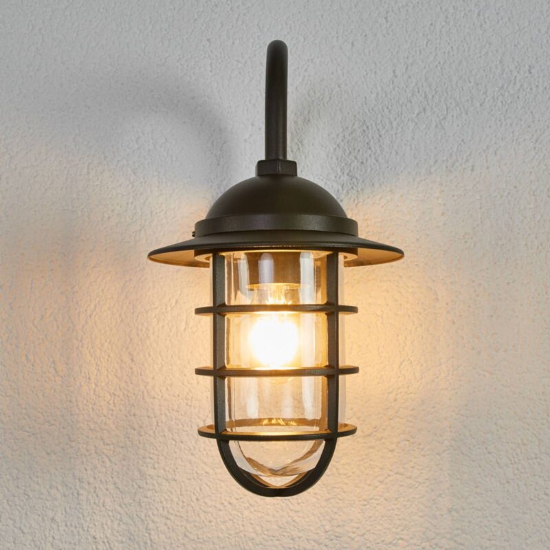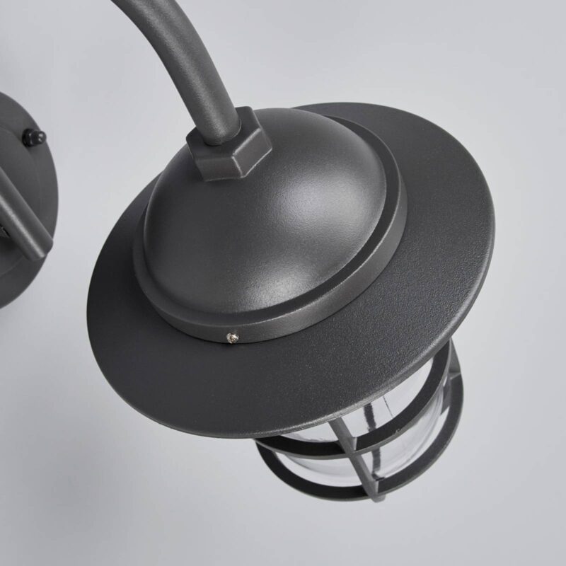 Exteriérové nástenné svietidlo v tvare lucerny Naila s tmavosivým hliníkovým rámom a skleneným vsadením Naila pôsobí svojím tvarom trochu nostalgicky a môže dobre harmonizovať aj s budovami, ktoré sú v skutočnosti o niečo staršie. Žiarovka je chránená kovovou mriežkou a čírym skleneným krytom, takže svetlo môže do okolia vystupovať bez prekážok. Exteriérové nástenné svietidlo má nádherný zahnutý tvar a emituje svetlo skôr nadol.