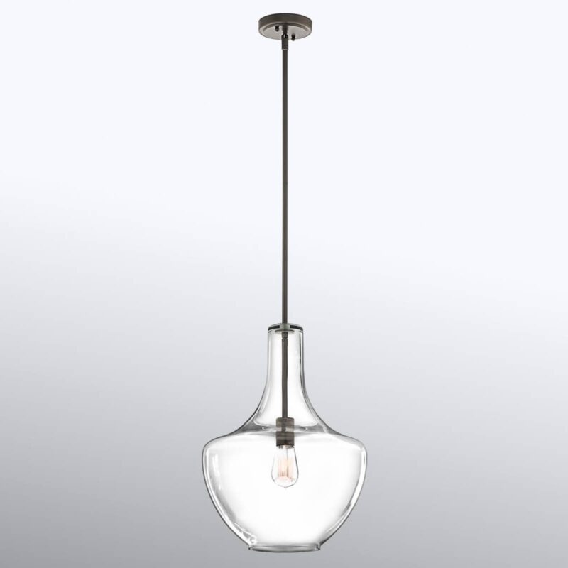Závesná lampa Everly vyrobená zo skla – Ø 35 cm Táto závesná lampa okamžite upúta pozornosť vďaka krásnemu tvaru skleneného tienidla. Sklo má svetelný vzor, ktorý je sotva viditeľný voľným okom, ale dodáva svetlu zvláštny lesk. Odpruženie je navrhnuté v bronzovej farbe a je vybavené rámom rovnakej farby, na ktorý sa zameriava pozornosť prostredníctvom priehľadného skla. Túto objímku je vhodné vybaviť trendovou vintage lampou, ktorá celkový vzhľad prívesného svetla Everly ešte skrášli.