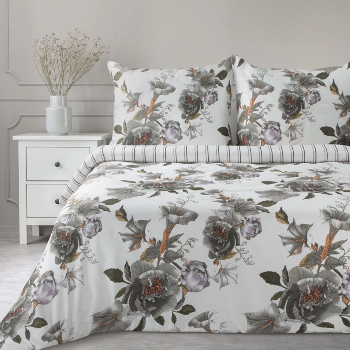 Obojstranné posteľné obliečky z bavlneného saténu – biele so sivými kvetmi 2 časti: 1ks 140×200 + 1ks 70×80