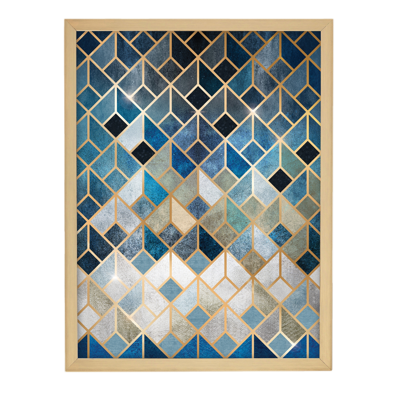 Obraz s abstraktným motívom geometrických vzorov v modrej a zlatej farbe v zlatom ráme.