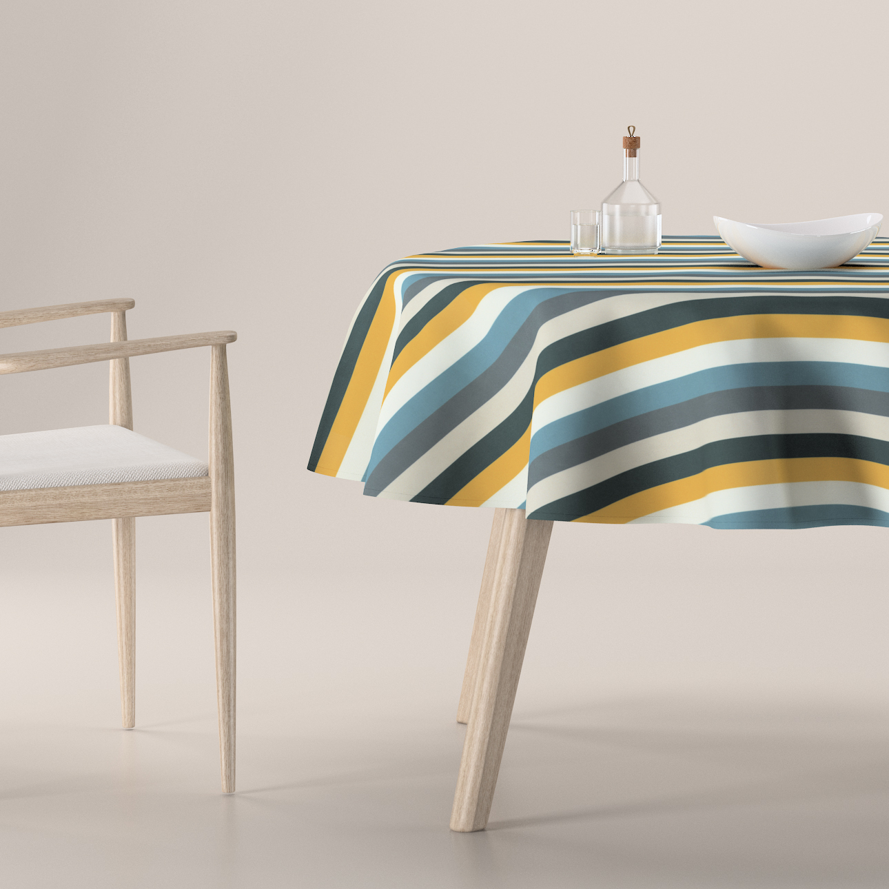 Obrus okrúhly, pásy v odtieňoch žlto-hnedo-modrých farbách, Vintage 70’s, 143-59
