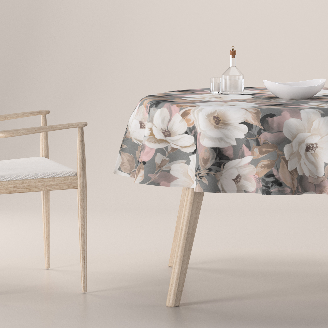 Obrus okrúhly, svetlé kvety na sivom podklade so svetlo ružovou a béžovou, Gardenia, 142-13
