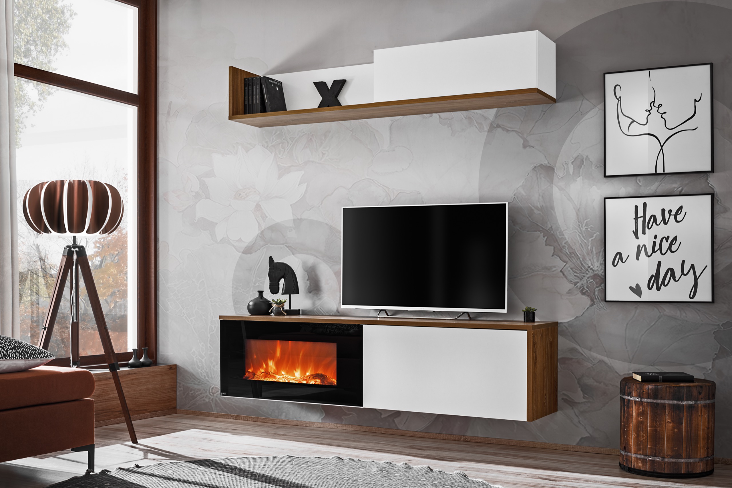 Domovská stránka » Katalóg » Obývacia stena Dalia E s elektrickým krbom,dub sterling/biela matná
