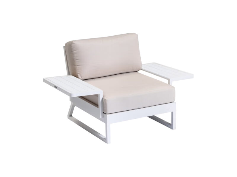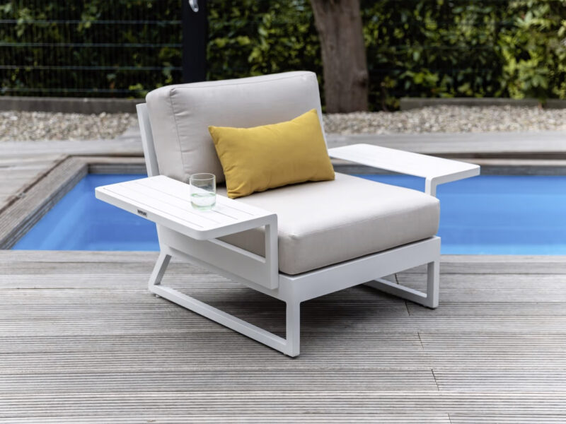 Elegantná odkladacia podrúčka v bielom hliníkovom prevedení, ktorá dopĺňa modulárny systém Ocean Skid Platform a prináša praktický priestor pre odloženie drobností.