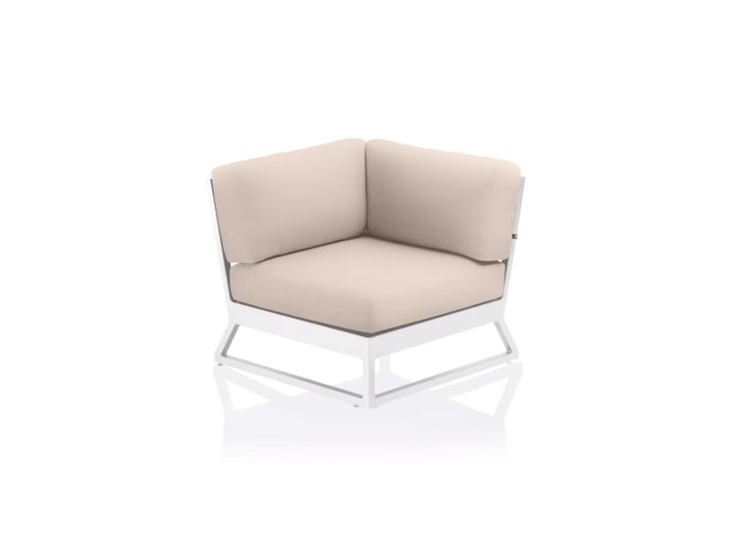 Ocean Skid Platform rohový modul s elegantným hliníkovým rámom a odolnou Sunbrella® látkou v odtieni bielej a „linen chalk“. Moderný a pohodlný modul, ideálny na relax do interiéru aj exteriéru.