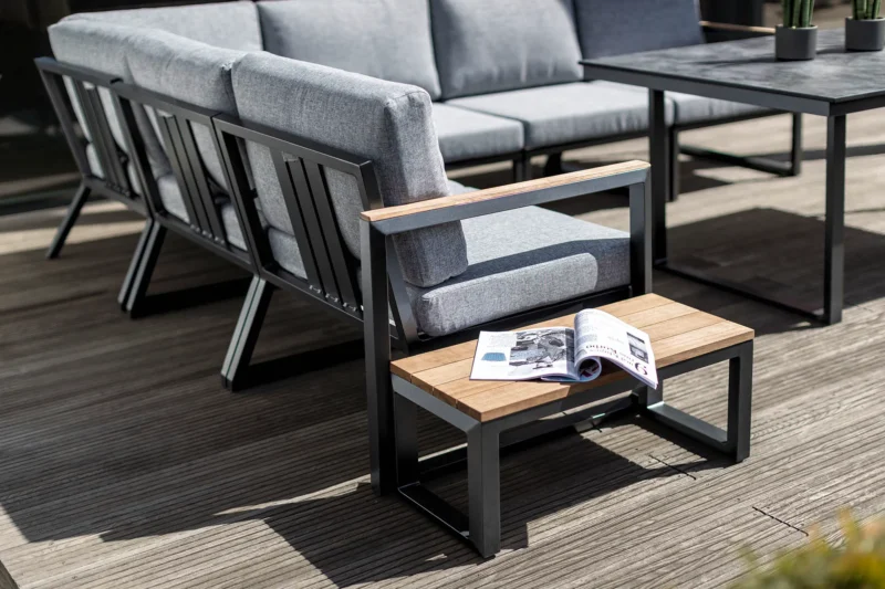 Oddýchnite si počas dňa a večer zakončite s priateľmi občerstvením a nápojmi – so sériou OCEAN SKID sa terasa stáva druhou obývačkou a teda vaším novým obľúbeným miestom. Pravý modul s teakovou podrúčkou sa dá využiť aj ako samostatné kreslo alebo pohovka a môže byť teda použitá ako samostatný prvok.
