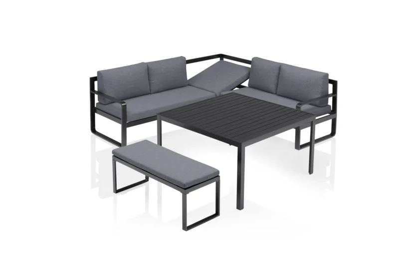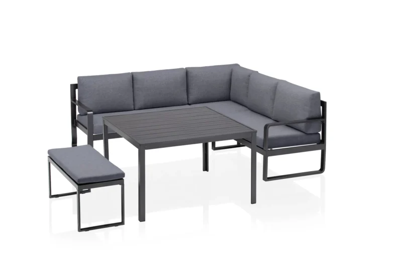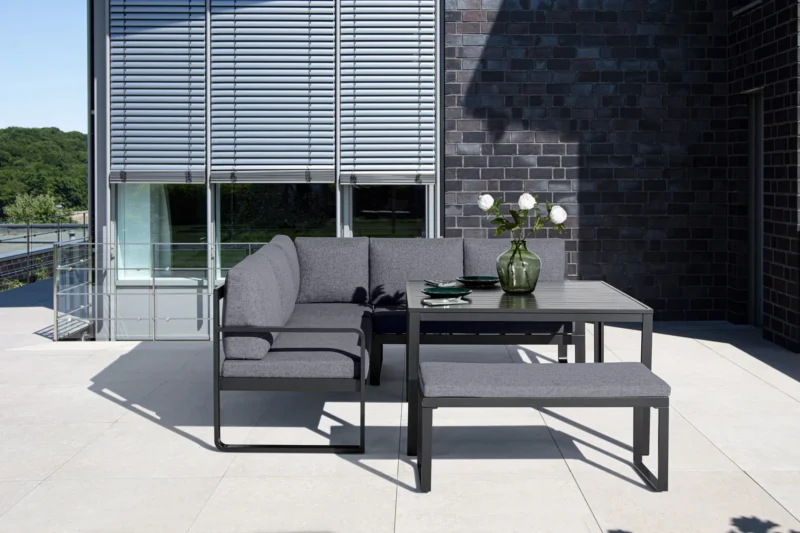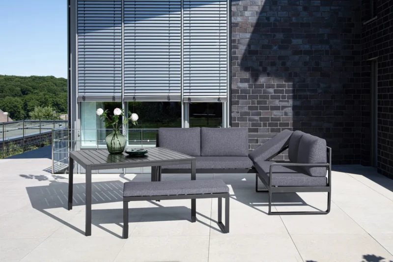 Rohovú súpravu OCEAN je možné optimálne využiť na oddych v čase obeda, ako aj na spoločné stolovanie. Súprava pozostáva z 3-sedu vľavo, 2-sedu vpravo, lavice a stola vrátane elegantných podsedákov v šedej farbe. Nastavením polohy sedenia v rohovom prvku 3-miestnej pohovky si vychutnáte poludňajšie slnko ešte lepšie!