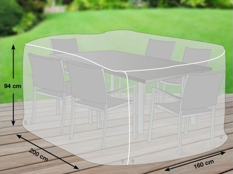Exteriérová ochranná plachta na stolovú súpravu M/L s rozmermi 200x160x94 cm.