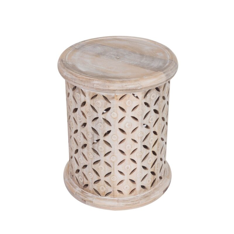 Drevený stolík s dierovaným vzhľadom, natretý na bielo. Originálny stolík vyrobený z dreva mangovníka, natretý na bielo. Krásne dierované prerezávanie mu dodáva jedinečný charakter. Dokonale sa hodí do interiéru zariadeného v boho štýle ako odkladací stolík. Postavený pri sedačke alebo kresle zaistí priestor pre drobné ozdoby, ako je váza alebo svietnik.Tento unikátny kus nábytku skompletizujte s inými stolíkmi podobného štýlu alebo s doplnkami, s ktorými dosiahnete mimoriadny výsledok.Rozmery: šír. 38 cm, hĺ. 38 cm, výš. 47 cm.