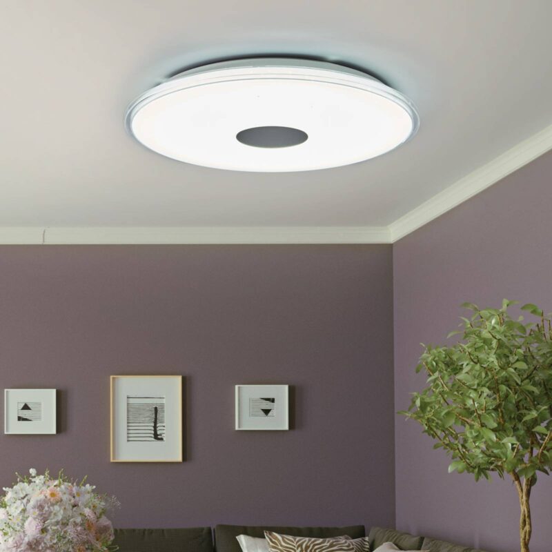 Shogun – štýlové stropné LED svietidlo s mnohými funkciami Stropné LED svietidlo Shogun je stelesnením multifunkčného stropného svietidla nádherného vzhľadu. Rovnako správne prostriedky poskytuje na deň aj na noc, aby poskytlo radosť z výrobku aj z osvetlenia. S diaľkovým ovládačom, ktorý je súčasťou dodávky, možno zvoliť farbu svetla v rozsahu od teplej bielej po denné svetlo, ako aj tlmiť intenzitu osvetlenia. Možno zvoliť tiež funkciu nočného osvetlenia, simulujúcu hviezdnu oblohu. Svietidlo Shogun však od počiatku presviedča nielen svojou flexibilitou – nemusí sa hanbiť ani za svoj vzhľad: svojím veľmi moderným kruhovým tvarom a satinovanou bielou farbou okúzľuje tienidlo vyhotovené z plastu aj vo vypnutom stave. A drobné, priesvitné otvory v tienidle sa postarajú o senzačný trblietavý efekt.