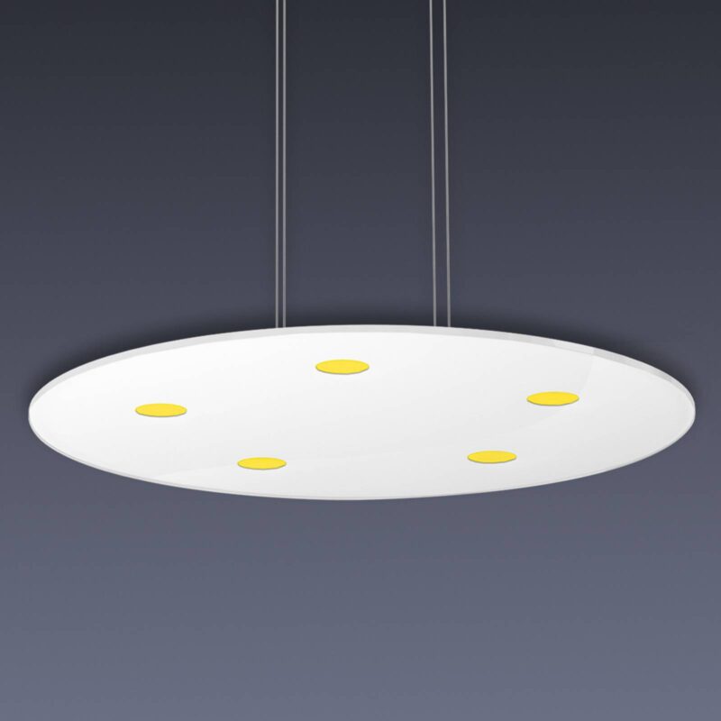 Krásna závesná lampa Sunia so stmieva? Toto okrúhle, veľmi ploché závesné svietidlo LED je prvotriedne svietidlo, ktoré dáva obývacej izbe moderný nádych. Svietidlo bolo vyrobené z nehrdzavejúcej ocele a bieleho skla ESG. Pomocou piatich LED diód dosahuje veľkorysé teplé biele svetlo. Svetlo je možné nastaviť na požadovanú intenzitu pomocou dotykového stmieva? . Vyrobené v Nemecku.