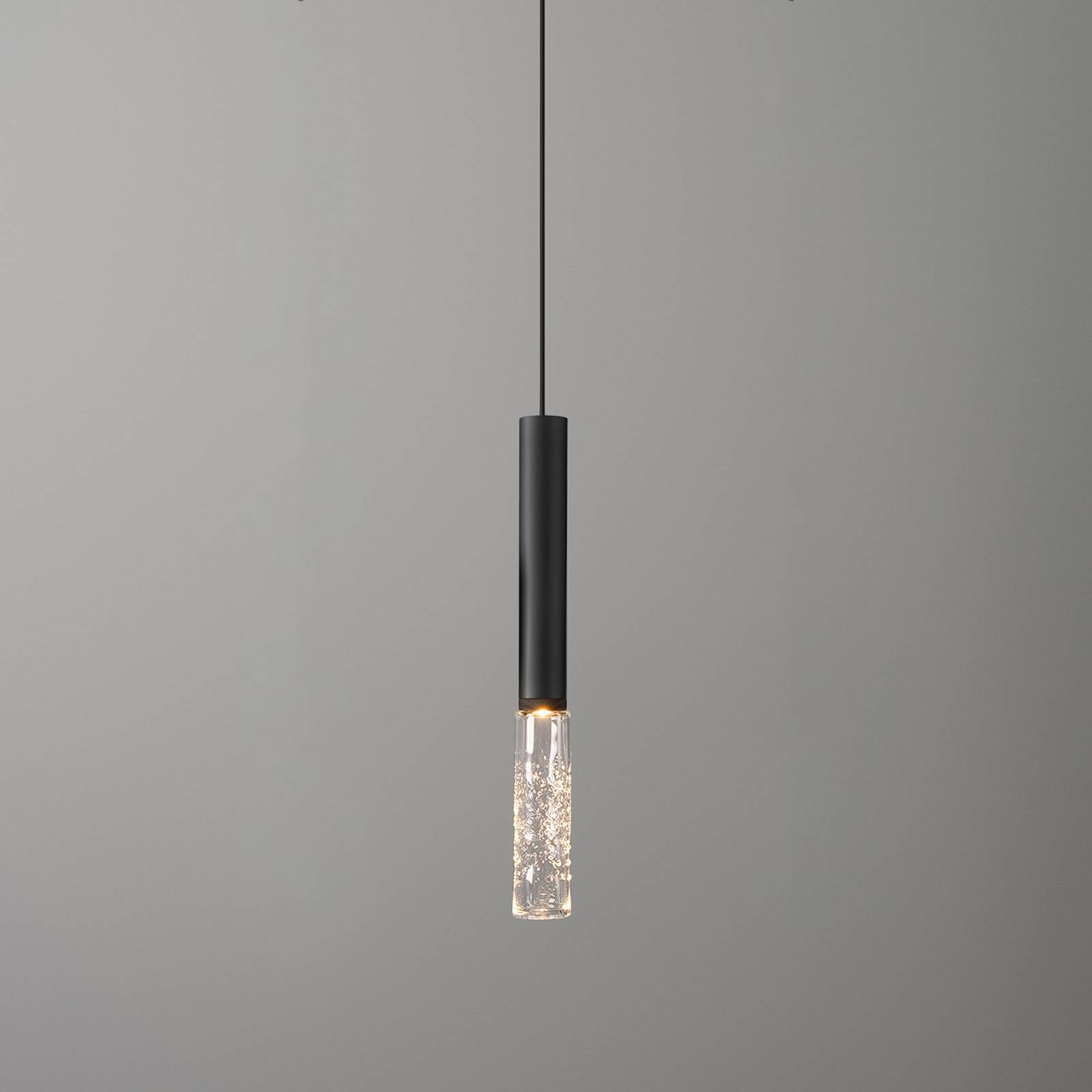 Závesné svietidlo LED Beam Stick Glass v tvare štíhleho valca Závesná lampa Beam Stick Glass, ktorú navrhol medzinárodne uznávaný dizajnér Marc Sadler, spája moderný dizajn, priame osvetlenie stola/oblasti a dekoratívny nádych. Štíhly valcovitý prívesok je pripojený k čiernemu káblu. Závesné svietidlo pozostáva z lakovaného hliníkového tela s vrúbkovaným vzorom na spodnom konci a integrovaným zdrojom svetla LED, ktorý svieti smerom nadol, ako aj z číreho skla pripevneného pod ním. Ten je vybavený nepravidelnými vzduchovými inklúziami, ktoré zabezpečujú atraktívne lomy svetla a dodávajú každému exempláru individuálny charakter. Ovládač LED (zapnutie/vypnutie) je integrovaný v okrúhlej strieške vo farbe svietidla. Závesné svietidlo LED presvedčí aj vynikajúcim podaním farieb (CRI 97), takže osvetlené predmety sú krásne zobrazené.