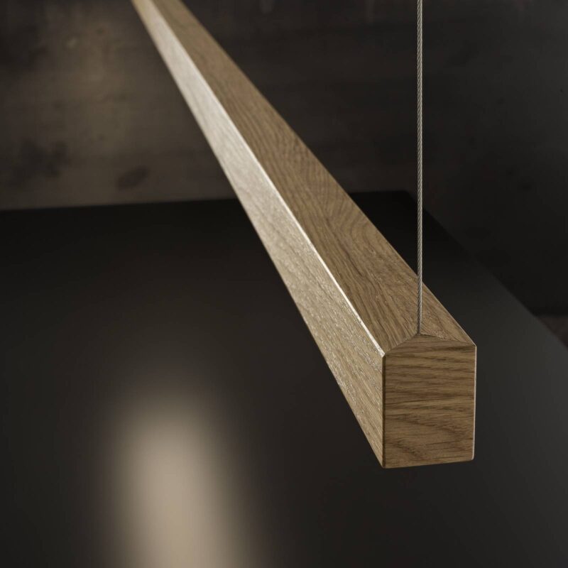 Štíhle drevené závesné svietidlo Lanacotta na priame osvetlenie Lanacottu navrhol taliansky architekt Carlo Cappellotto. Závesné svietidlo LED kombinuje moderný dizajn a technológiu LED s prírodným drevom. Tienidlo je vyrobené v tvare podlhovastej kocky z dreva duba sedmohradského, ktoré svojou kresbou dodáva každému kusu individuálny, prírodný charakter. Spodná časť tienidla je otvorená, takže LED diódy nainštalované vo vnútri po celej dĺžke osvetľujú priestor pod ním. Po stranách sa zamedzuje oslneniu. Vynikajúce podanie farieb (CRI 97) zaručuje ideálne zobrazenie osvetlených objektov.