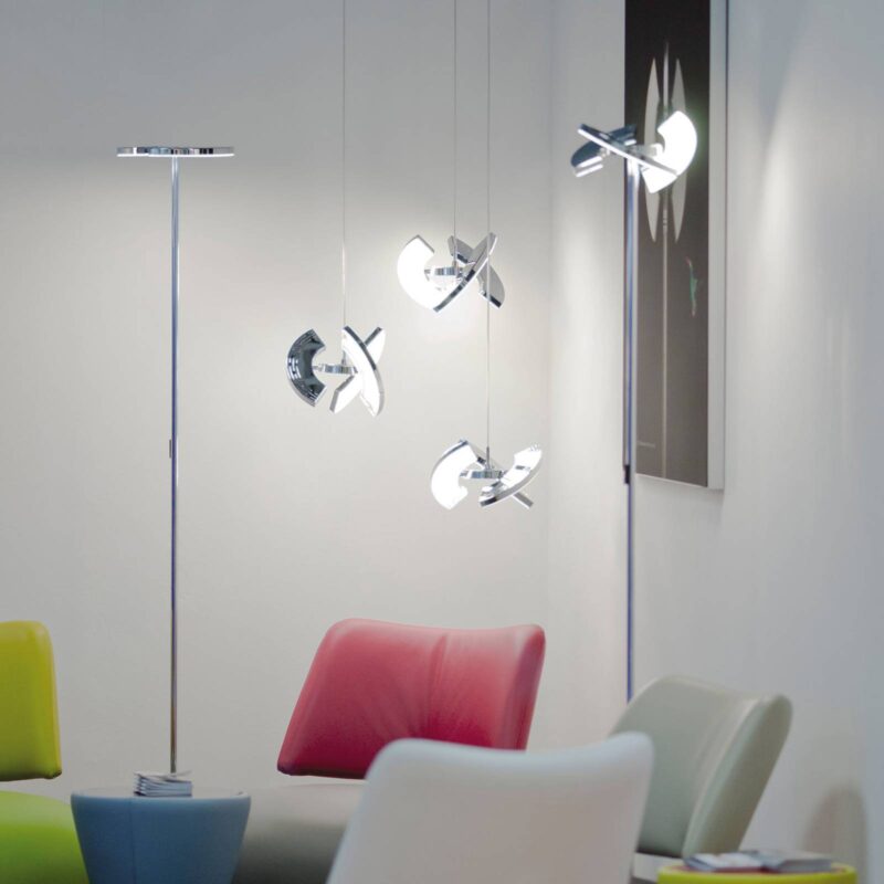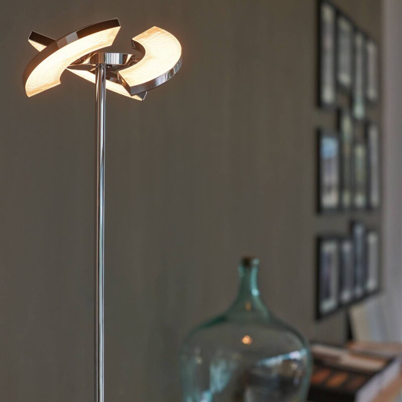 LED stojacia lampa Trinity s tromi otočnými LED prvkami: vynikajúci dizajn Túto LED stojaciu lampu s premenlivým svetelným efektom možno ľahko integrovať do mnohých moderných štýlov interiéru. Elegantný dizajn a vysoká funkčnosť robia zo svietidla Trinity svietidlo, ktoré patrí do svojej vlastnej triedy. Stojacia lampa vyrobená z kovu s chrómovou povrchovou úpravou je vybavená tromi svetelnými segmentmi, z ktorých každý sa dá nielen otáčať o 320 stupňov, čo umožňuje individuálne nasmerovanie svetla, ale aj individuálne prepínať a stmievať. Na to slúžia tri bodové tlačidlá na hornej strane stojacej lampy, ktoré sú zároveň skvele integrované do dizajnu. Svetelný efekt je mimoriadne pôsobivý vďaka brilantnému hranolovému dizajnu Trinity. Teplé biele svetlo LED diód sa vyžaruje bez oslnenia na veľkej ploche. Či už v obývačke alebo v spálni, voľne stojace svietidlo Trinity LED poskytuje osvetlenie podľa individuálnych potrieb s individuálne nastaviteľnými svetelnými scénami. Integrovaná pamäťová funkcia: To znamená, že nastavenie, ktoré existovalo pred vypnutím, existuje aj po opätovnom zapnutí. Ocenené Reddot Design Award 2011, Interior Innovation Award 2012, German Design Award 2013 (Zvláštne uznanie) a ako Svietidlo roka 2011 (2. miesto).