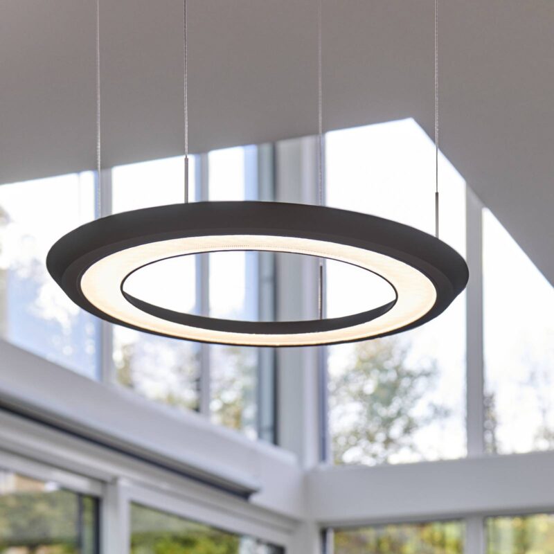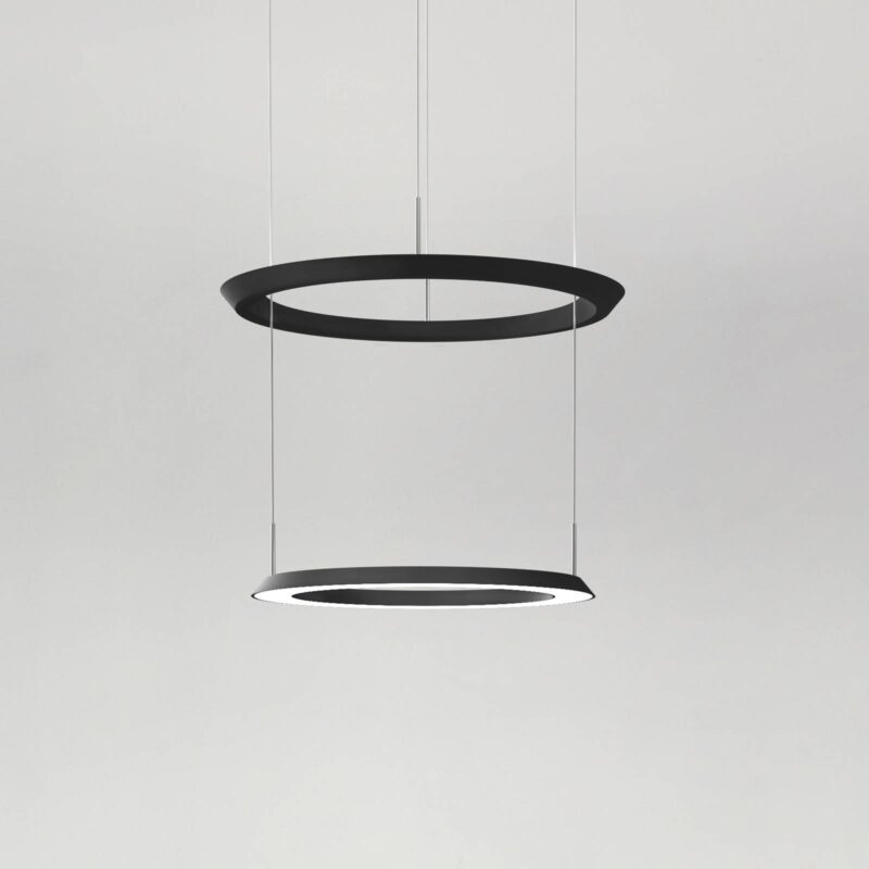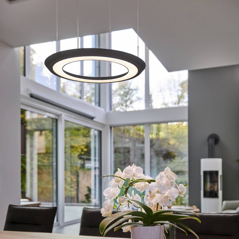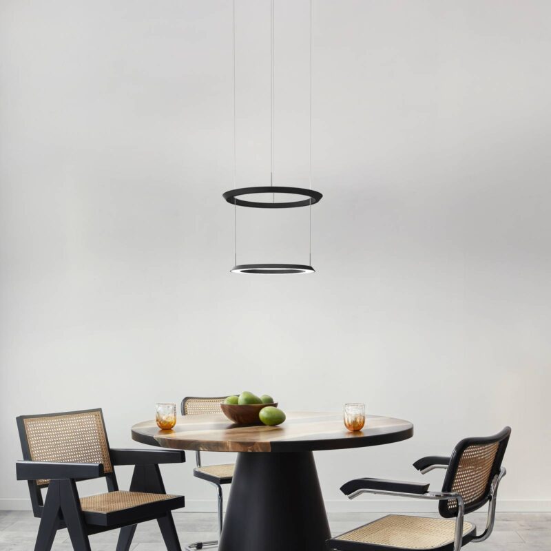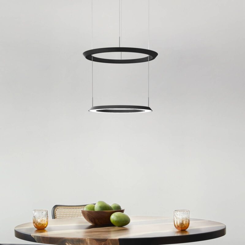 Závesné svietidlo LED Yano s horným a dolným vyžarovaním v štíhlom kruhovom dizajne – výškovo nastaviteľné, ovládané pomocou aplikácie alebo gestami Závesné svietidlo Yano LED v sebe spája moderný dizajn a pokročilú technológiu osvetlenia. Pod baldachýnom visia na dvoch štíhlych lanách dva kruhy rôznych veľkostí. Väčšia je vybavená LED diódami svietiacimi nahor, LED diódy integrované v menšej sú orientované smerom nadol. Oba svetelné zdroje možno samostatne prepínať, stmievať a nastavovať farbu svetla, aby sa podľa potreby upravilo základné a priame osvetlenie. Svietidlo možno ovládať gestami, a to priblížením ruky k snímačom v krúžkoch. Inteligentné ovládanie je možné aj pomocou aplikácie Casambi na tablete/smartfóne. Ďalšiu flexibilitu poskytuje individuálne nastavenie výšky každého krúžku. – Možnosť stmievania, funkcia CCT (teplá biela až univerzálna biela) – Oddelené ovládanie horného a dolného svetla pomocou aplikácie Casambi (bezplatne dostupná pre iOS a Android) alebo prostredníctvom ovládania gestami (možnosť konfigurácie cez aplikáciu). – Prepojenie so smartfónom/tabletom cez Bluetooth – Plynulé nastavenie výšky od 30 cm do 160 cm celkového zavesenia – Dobré podanie farieb: CRI > 90 – Dizajn: Klaus Liese