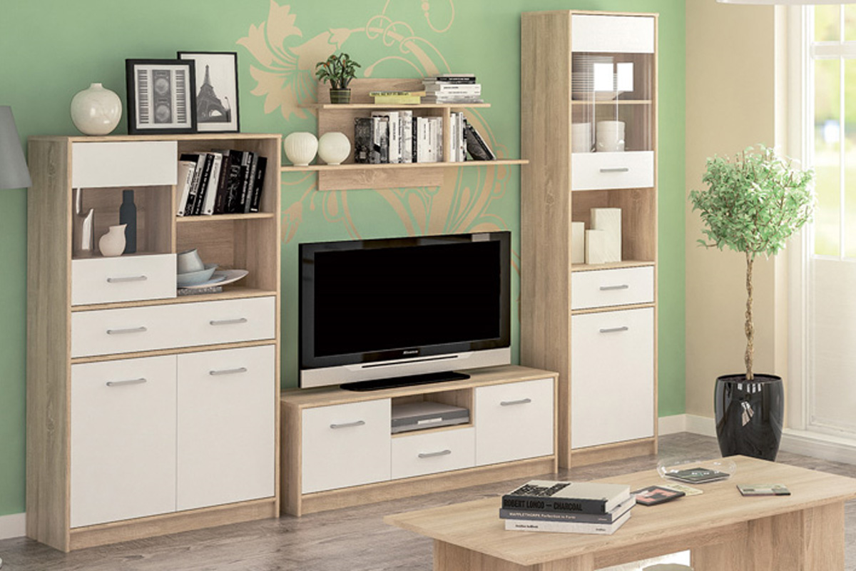 Obývacia stena OLINO je nábytok v jednoduchom dizajnovom prevedení.Tento cenovo výhodný nábytok je ideálnou voľbou do modernej obývačka. Zabezpečí dostatok odkladacieho priestoru a účelne využije priestor. Nábytok je v módnom a stále žiadanom farebnom prevedení dub sonoma/ biela.Celkový vzhľad nábytku dopĺňajú elegantné strieborné úchyty.Obývacia stena sa skladá z:1. Vysoká kombinovaná skrinka, (š/v/h): 83,4 x 144,2 x 34,3 cm2. TV stolík, (š/v/h): 123,2 x 42 x 38,3 cm3. Vysoká vitrínová skrinka, (š/v/h): 50,2 x 195 x 34,3 cm4. Polička, (š/v/h): 120 x 55 x 23 cm.Nábytok je vyrobený z kvalitnej a ľahko udržateľnej LTD dosky. Korupus je vo farbe dub sonoma, dvierka v bielej farbe.Dodávame v demonte.