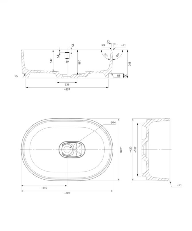 OMNIRES – CADENCE M+ umývadlo na dosku, 62 x 42 cm biela mat /BM/ CADENCE620BM