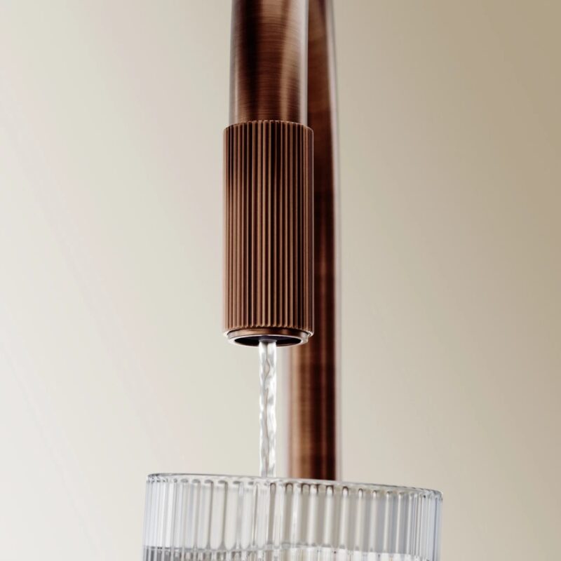 Kuchynská batéria OMNIRES SWITCH kombinuje minimalistický dizajn založený na vyvážených proporciách s praktickou funkčnosťou, poskytuje bežnú a filtrovanú vodu. Výrazné, precízne rebrované detaily umožňujú intuitívne použitie tým, že označujú dva nezávislé body otvorenia vody: bežnú vodu na mixéri a filtrovanú vodu na konci výtoku – stačí otočiť krúžkom umiestneným na ňom a naplniť pohár rýchlym prúdom pitnej vody s najvyššou chuťou. Batéria je k dispozícii v sete so systémom vodnej filtrácie Dafi, ktorý sa skladá z filtračnej patróny a prietokomeru. Technológia aktívneho uhlia a živice použitá vo filtri umožňuje znížiť obsah chlóru a ťažkých kovov a taktiež znížiť úroveň tvrdosti vody. Výmena filtra je extrémne jednoduchá a merač o jej nutnosti informuje na základe skutočného prietoku vyčistenej vody. Prvky filtračného systému sa ľahko inštalujú do akejkoľvek štandardnej drezovej skrinky. Výrobok je vyrobený z vysoko kvalitnej mosadze a vybavený najkvalitnejšou keramickou hlavou s technológiou COLD START. Vďaka tomu sa prúd na umývanie rúk a riadu štandardne otvára studenou vodou, čo šetrí energiu a spotrebu teplej vody. Vertikálna východisková poloha batérie umožňuje inštaláciu batérie blízko steny bez toho, aby ste sa museli starať o priestor potrebný na jej otočenie pre otvorenie zdroja vody. Starožitná meď je výrazná povrchová úprava s červenohnedým tónom a kartáčovanou textúrou vo vintage štýle. Dizajn: Paulina Shacalis, Štúdio OMNIRES Ocenenie: Nemecká cena za dizajn, musíte mať Čestné uznania: Dobrý design otočný dvojcestný výtok s funkciou filtrovanej vody sada obsahuje filtračnú sadu ( filtračná patróna , elektronický prietokomer a pásik pre kontrolu tvrdosti vody) keramická hlava s technológiou COLD START rozsah výtoku: 22,6 cm výška odtoku vody: 25,5 cm celková výška batérie: 44,5 cm maximálna hrúbka dosky stola: 3,5 cm(GT) Ean: 5902539885095