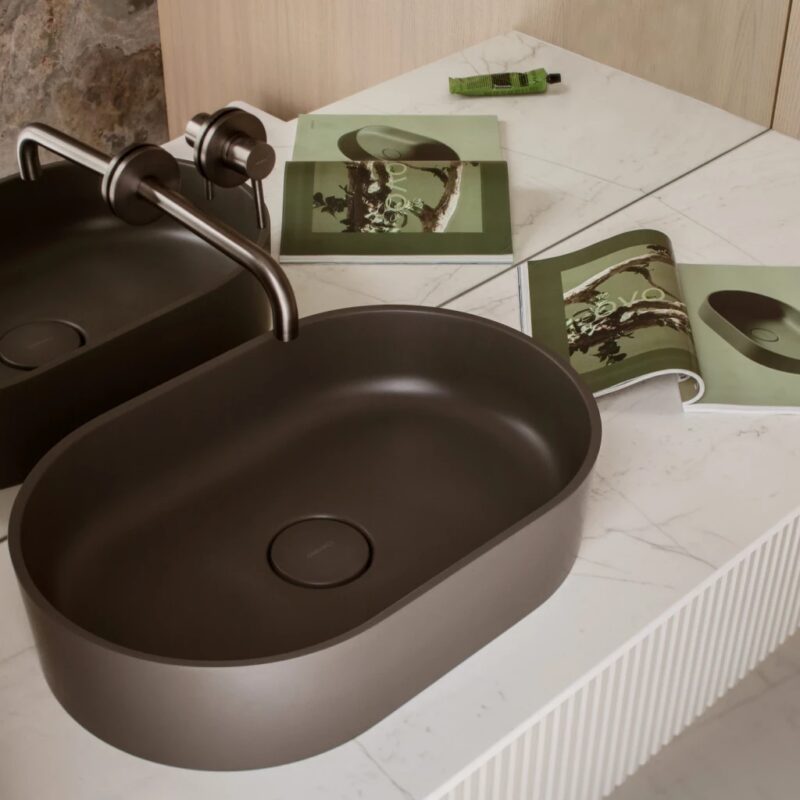 OVO v popolavo šedej (RAL7022) je umývadlo v elegantnom odtieni teplej šedej, so zamatovým, matným povrchom.Dizajn: Paulina Shacalis, Štúdio OMNIRESOcenenie: Red Dot Design Award, German Design Award, Design Plus Powered by ISH 2023, Must Have, Good Design