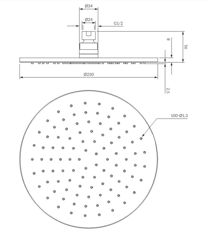 Sprchová hlavica vnútorne potiahnutá gumou ponúka dodatočnú ochranu proti poškodeniu. mosadz rozmery: ø25 cm, hrúbka: 0,9 cm 1-funkcia 1/2″ prípojka vody prietok: ~22 l/min.(GT) Ean: 5902539875201
