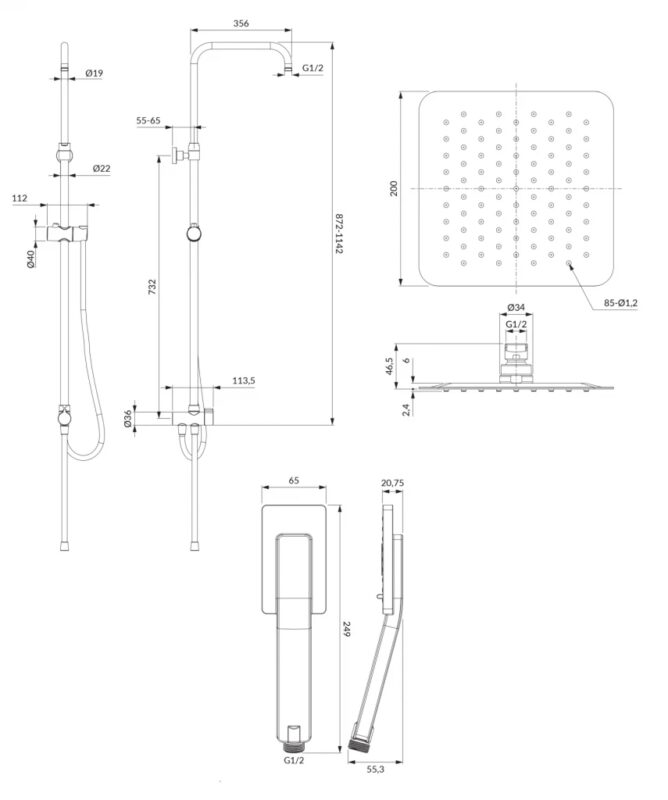 na montáž s akoukoľvek prisadenou sprchovou alebo vaňovou batériou sprchový stĺp s prepínačom a ramenom dažďovej sprchy rozstup upevnenia: 73,2 cm nerezová dažďová sprcha, rozmer: 20 x 20 cm, dosah ramien od steny: ~41 cm sprchová rukoväť, 3-funkcia, typ prúdu: dážď, bič, zmiešaný sprchová hadica s kovovým plášťom, dĺžka: 150 cm pripojovacia hadica k sprchovej batérii otočné rameno nastaviteľná výška, minimálna/maximálna výška systému: 87,2 cm/114,2 cm(GT) Ean: 5901867772930