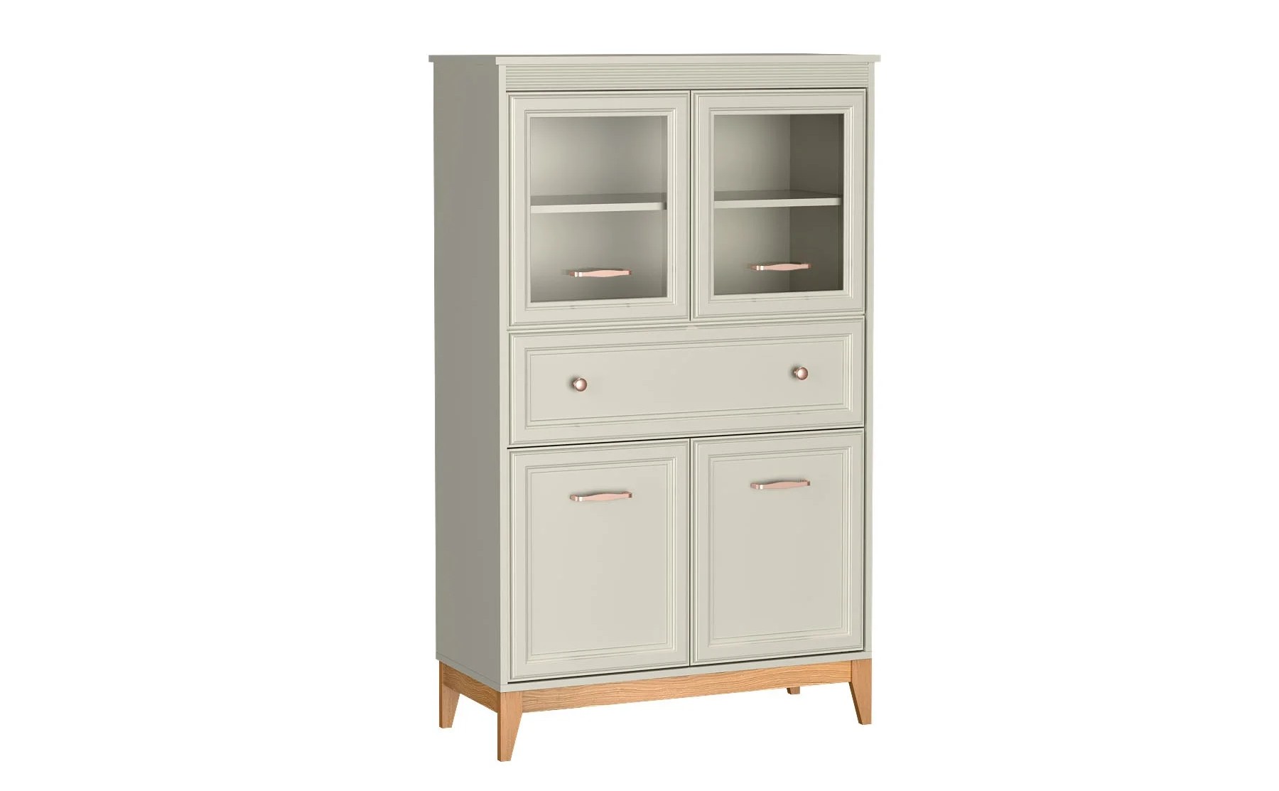 Kolekcia ONTARIO je kombináciou nadčasového štýlu a funkčnosti, ktorá vnesie do vášho interiéru harmóniu a eleganciu . Jemné frézovanie na predných čelách, minimalistické úchytky a dokonale zladené proporcie dodávajú nábytku jedinečný charakter. Dizajn, ktorý sa hodí do každého interiéru. Jemné, prírodné farby kolekcie ONTARIO z nej robia perfektný doplnok pre klasické aj moderné zariadenia. Prírodné drevené akcenty zahrejú priestor a vytvoria útulnú, no zároveň štýlovú obývačku. Inšpirovaná klasickým remeselným spracovaním, no zároveň prispôsobená moderným interiérom, kombinuje teplo prírodného dreva s jemným odtieňom kašmíru . Je to nábytok, ktorý vytvára domov plný harmónie – miesto, kde každý predmet má svoj príbeh.Vitrína ONTARIO – klasická elegancia v odtieni kašmíruVitrína je stelesnením elegancie a prepracovaného remeselného spracovania. Jej jemný kašmírový odtieň dodáva interiéru ľahkosť a harmóniu, zatiaľ čo ozdobné MDF lišty na predných stranách zdôrazňujú klasický charakter nábytku. Horná časť vitríny pozostáva z dvoch presklených skriniek, ktoré sa perfektne hodia na vystavenie porcelánu, skla, dekoratívnych doplnkov alebo obľúbených kníh. Vďaka preskleniu sa vnútro nábytku presvetlí a predmety umiestnené vo vnútri sa stanú elegantným dekoratívnym prvkom. Nižšie sa nachádza praktická zásuvka s pevnými kovovými úchytkami v zlatej farbe – ideálna na malé doplnky, obrúsky alebo dokumenty. Spodná časť pozostáva z dvoch uzatvárateľných skriniek, ktoré ponúkajú dostatok úložného priestoru na veci, ktoré nemusia byť na očiach.✔ Štýlové detaily – jemné frézovanie a ozdobné MDF lišty dodávajú komode jedinečné čaro.✔ Pevná konštrukcia – stabilné nohy z masívneho dubového dreva zaručujú odolnosť a prirodzenú krásu.✔ Funkčnosť v elegantnej forme – priestranné zásuvky poskytujú vynikajúcu organizáciu priestoru.Vlastnosti produktu:farba korpusu: kašmír1 zásuvka + dvereozdobná lišta pod doskufrézované MDF čelánohy z masívneho dubového dreva – 15 cmštýlové kovové úchytky medenej farbyrozmery: (Š/H/V) 92 × 40,5 × 150,5 cmpánty s mäkkým zatváranímkorpus – laminovaná nábytková doskačelá – MDF doskahrana – ABS dyhaTovar dodávame v demonte s prehľadným návodom na montáž.