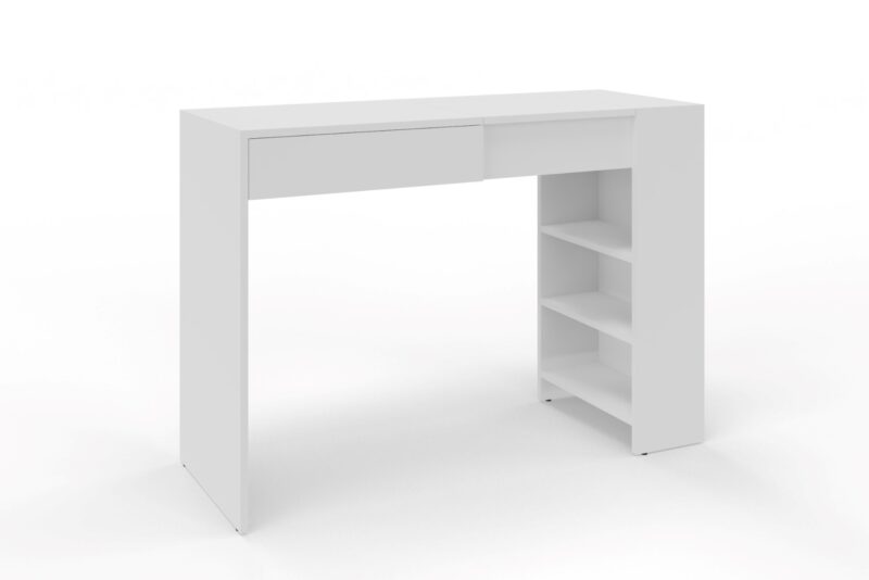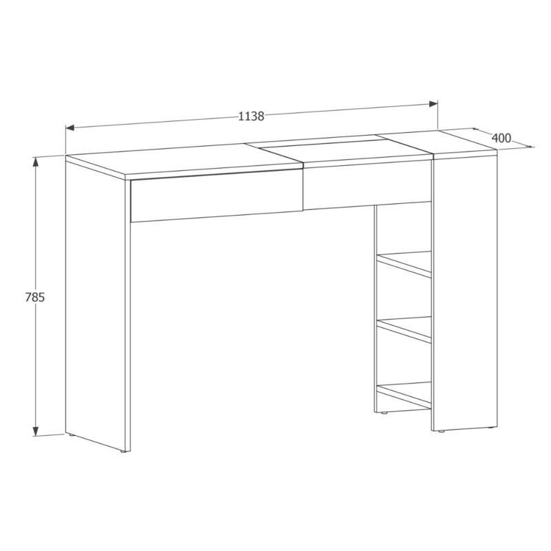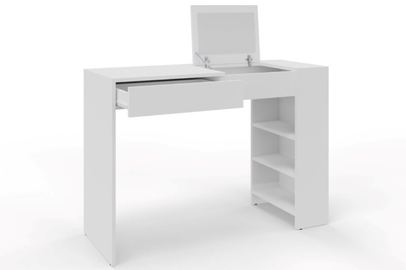 OPEN MAX je moderný toaletný stolík s viacnásobným využitím. V základnej polohe ho viete využiť ako klasický písací stôl. Po otvorení výklopnej dosky so zrkadlom z neho máte za pár sekúnd praktický toaletný stolík. Oceníte aj praktickú zásuvku a tiež otvorené police z vnútornej strany stolíka na odkladanie drobností. Stolík je vyrobený z kvalitnej LTD dosky, ktorá nie je náročná na údržbu.Farebné prevedenie: biela.Rozmery: (š/v/h) 114 x 78 x 40 cm Dodávame v demonte.