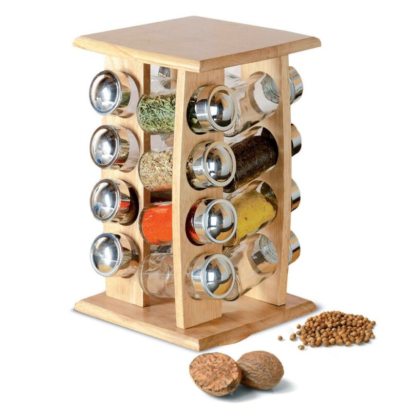 Sada koreničiek je ako praktický, tak moderný pomocník do vašej kuchyne. 16 koreničiek v drevenom otočnom stojane vašu kuchyňu zaručene oživí, ale aj uľahčí vašu prácu.Stojan je vyrobený z tvrdého dreva. Koreničky s objemom 80 ml sú sklenené s pochrómovaným uzáverom a plastovým sypadlom.Korenie nie je súčasťou koreničiek.