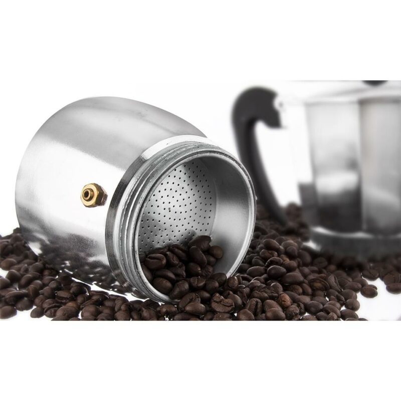 Tradičný kávovar pre rýchlu a lacnú prípravu mimoriadne chutného espressa je vhodný pre použitie na plynových, elektrických a sklokeramických doskách. Jednoducho naplníte spodnú časť kávovaru teplou vodou a vložíte zásobník s kávou, naskrutkujete vrchnú časť kávovaru a môžete začať variť. Tlakom vznikajúcim pri varu sa espresso dostane do hornej nádobky a vy môžete nalievať.Materiál: zdravotne nezávadný hliník, držadlo – žiaruvzdorný plast, silikónové tesnenie – súčasťou balenia 1x náhradné tesnenie. Kávovar je opatrený bezpečnostnou poistkou.